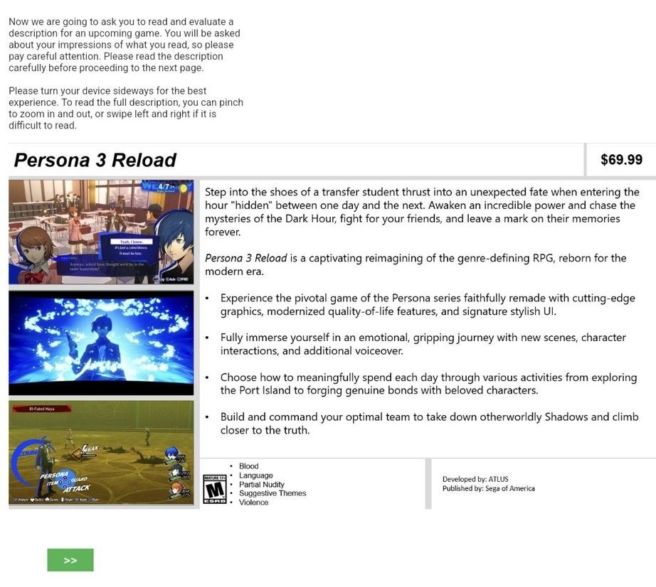 國外玩家AndresL_1997發推文表示自己收到了世嘉關於《女神異聞錄3 Reload》的調查問卷,卻意外發現價格信息。頁面顯示,該遊戲的售價爲69.99美元,把他嚇得不輕。