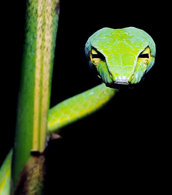 與許多毒蛇種類的垂直狹縫瞳孔相比,它們是唯一一種具有水平瞳孔的蛇,可以採取雙眼並視的模式。