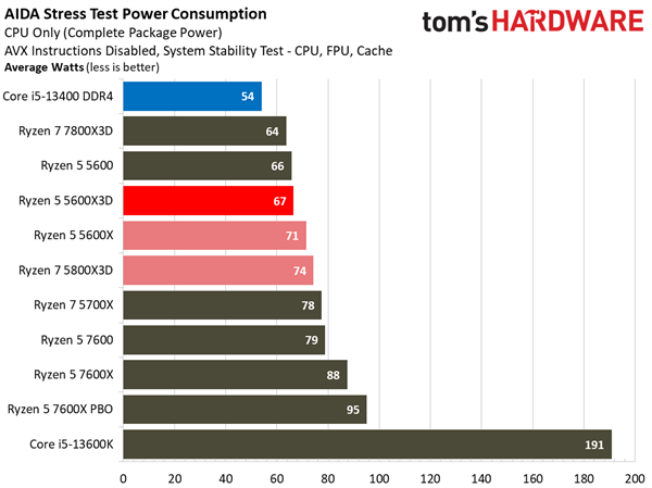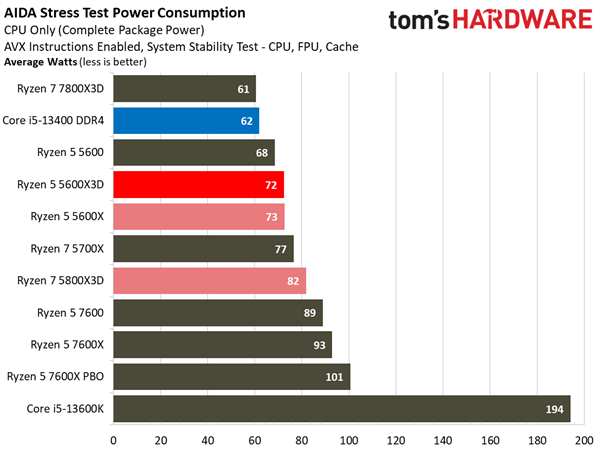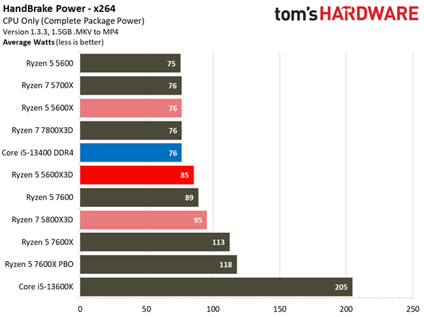 就功耗而言,儘管銳龍5 5600X3D的標稱TDP爲105W,但實際功耗最多隻有87W,能效表現良好。