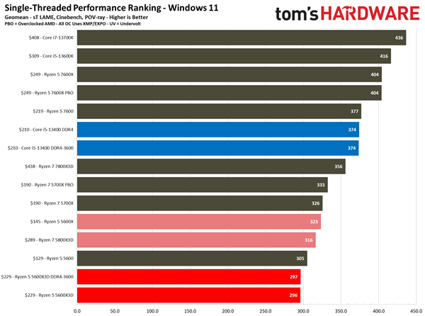 與競品相比,銳龍5 5600X3D領先於i5-13400大約20%,優勢非常明顯,並且已經非常接近i5-13600K的性能水平。
