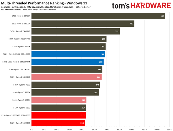 當然,由於3D緩存的存在,銳龍5 5600X3D的頻率降低了一些,因此在常規性能方面稍遜一籌。與i5-13400相比,銳龍5 5600X3D的單核性能和多核性能分別較慢了26%和35%。