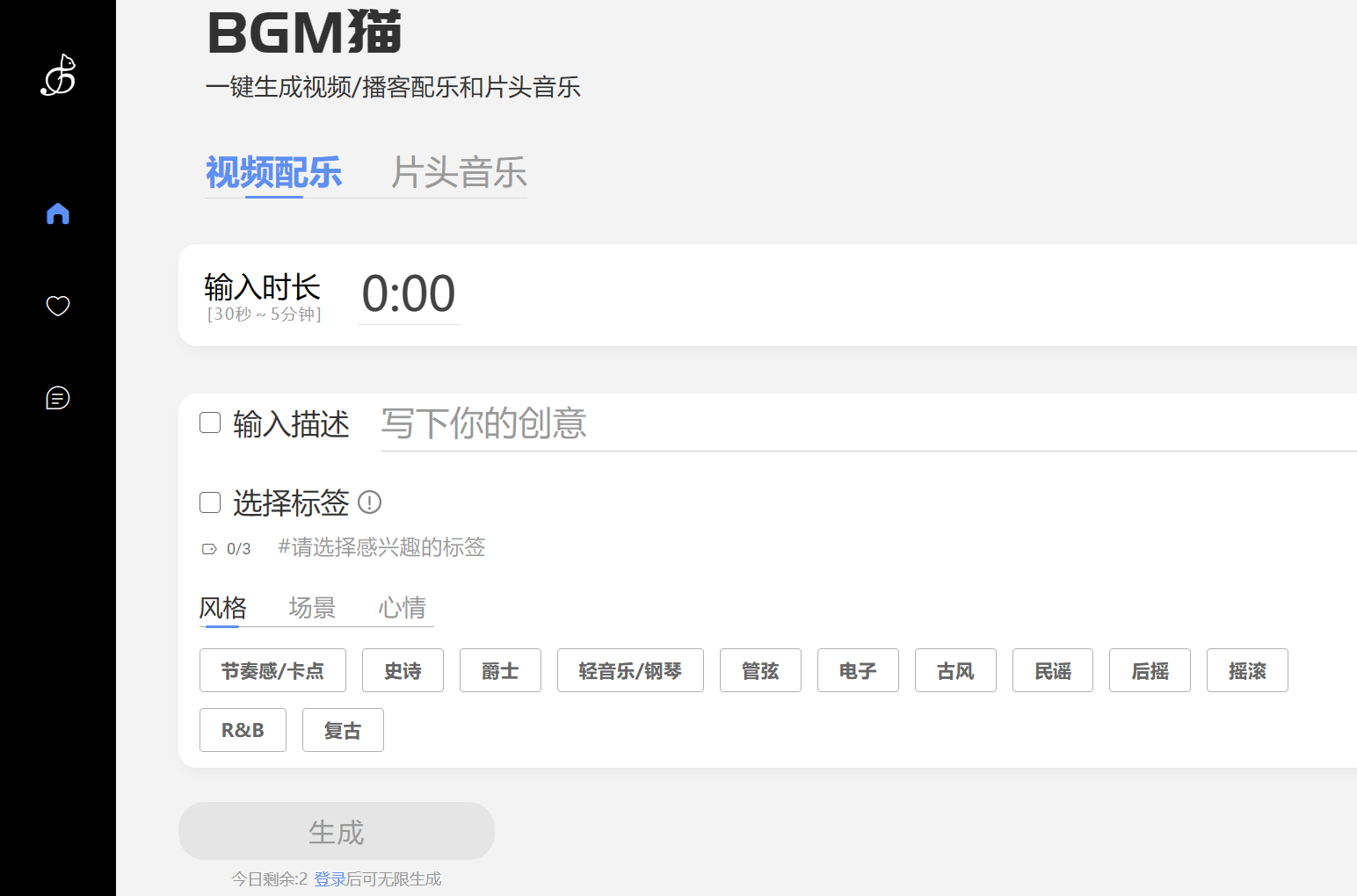 你用過AI對話,你瞭解AI繪畫,可你可能不大清楚AI音樂……BGM貓就是一個AI定製背景音樂下載平臺,簡單設置一下時長、風格、場景、心情,就能一鍵生成視頻/播客配樂和片頭音樂。