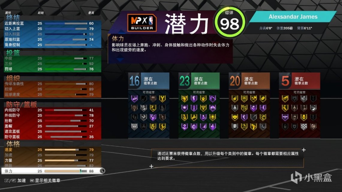 进入MC模式后,依然是熟悉的建模,玩家可以通过自己的喜好选择球员的位置,身高和体重。除此之外,玩家需要根据自己喜爱的比赛风格为球员进行不同潜在能力的选择,而能力值与能力徽章又是息息相关的,所以每一种能力值的选择都代表着不同的建模。而这一代的建模有着很大的不一样,以前几代NBA2k的全能建模(半神建模)不可以建出来了,每一种建模都有其明显的长处和短板,专精于某项能力。这种做法的好处是公园模式不会有千篇一律的建模,但是也意味着玩家不能通过一种建模获取到不同建模的乐趣。