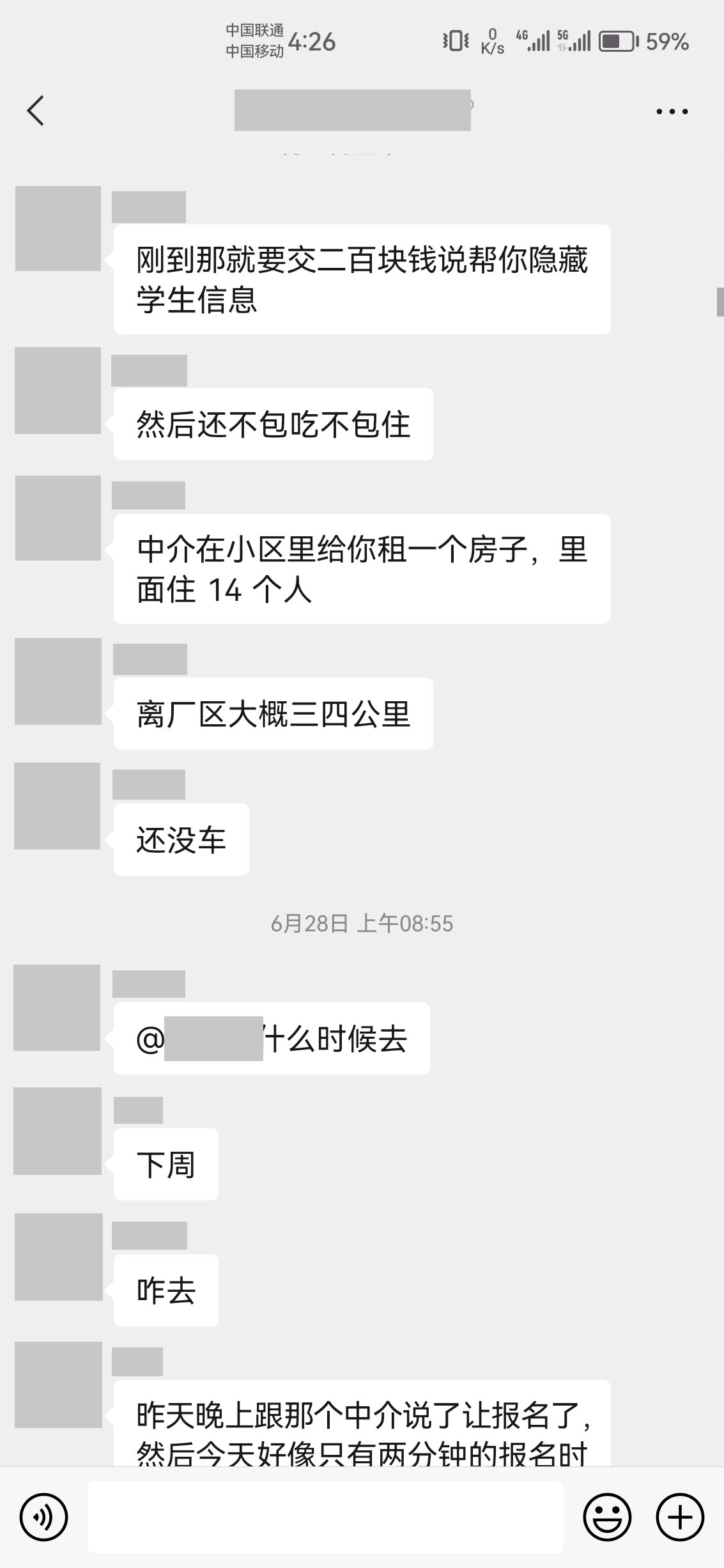 我身邊有同學相信網絡中介,拉了一堆人去那裏幹活,結果一人收了二百保密費(保密你是學生的費用)14人住一個小區房,最後才知道上面還有一箇中介,保密費都不要了直接潤了