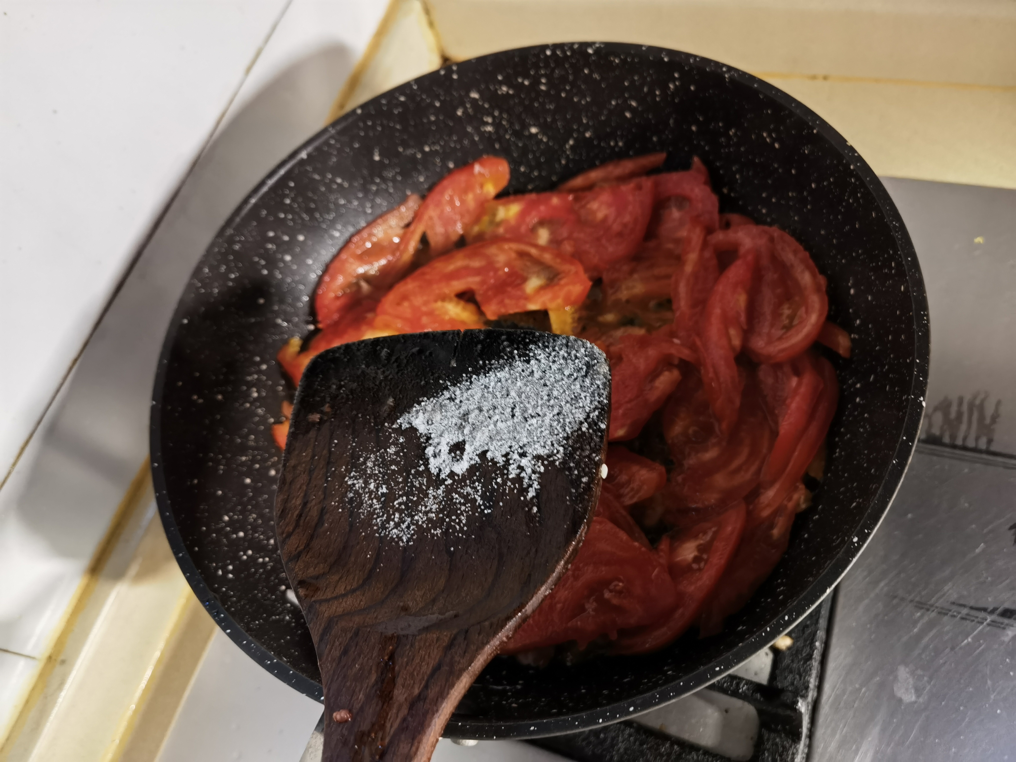 中火下入番茄,將番茄炒軟一點,加少許鹽、少許生抽促進番茄出水,