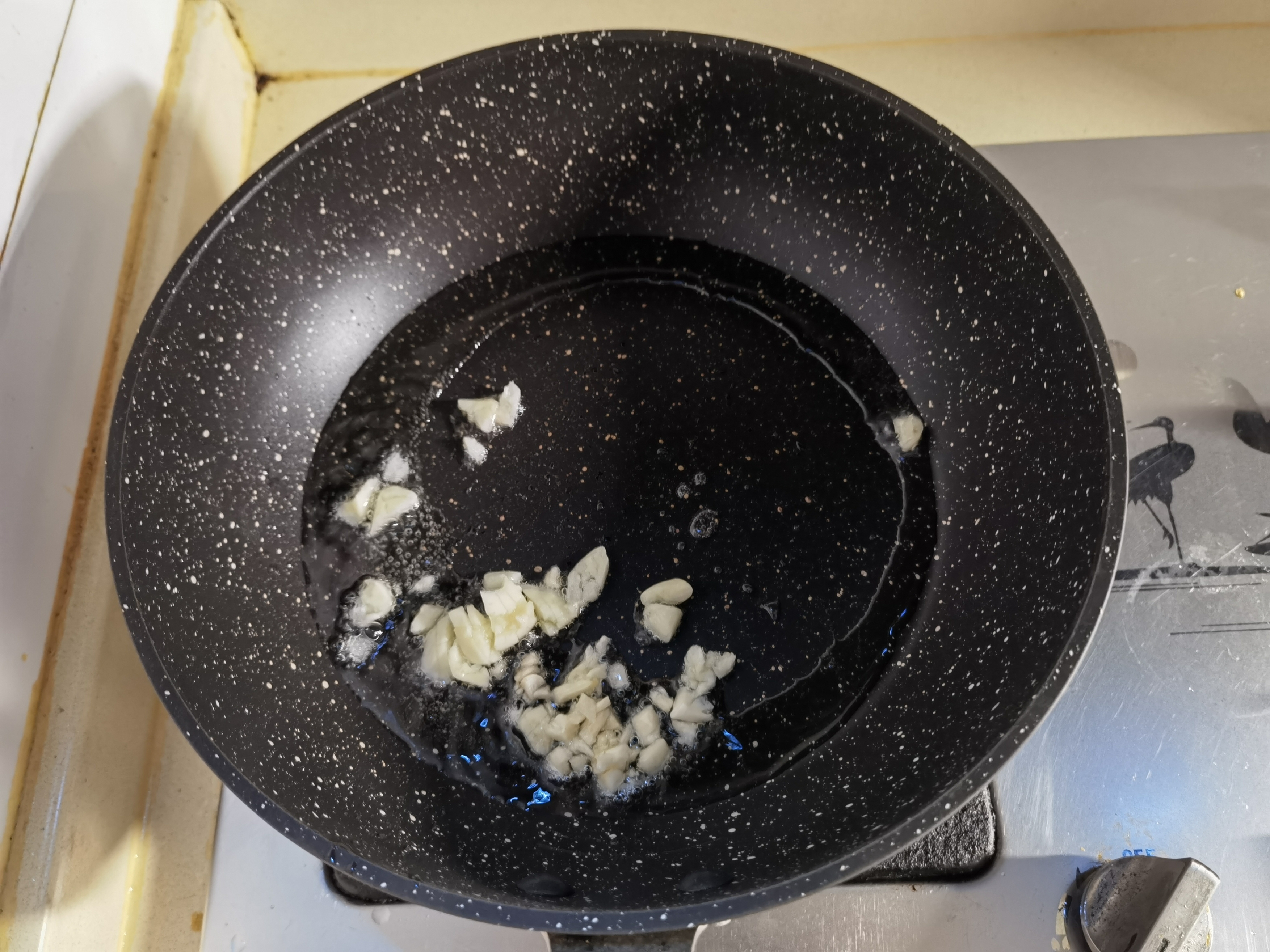 鍋內倒油,油四成熱下入蒜末開中小火炒香,大約10 s,