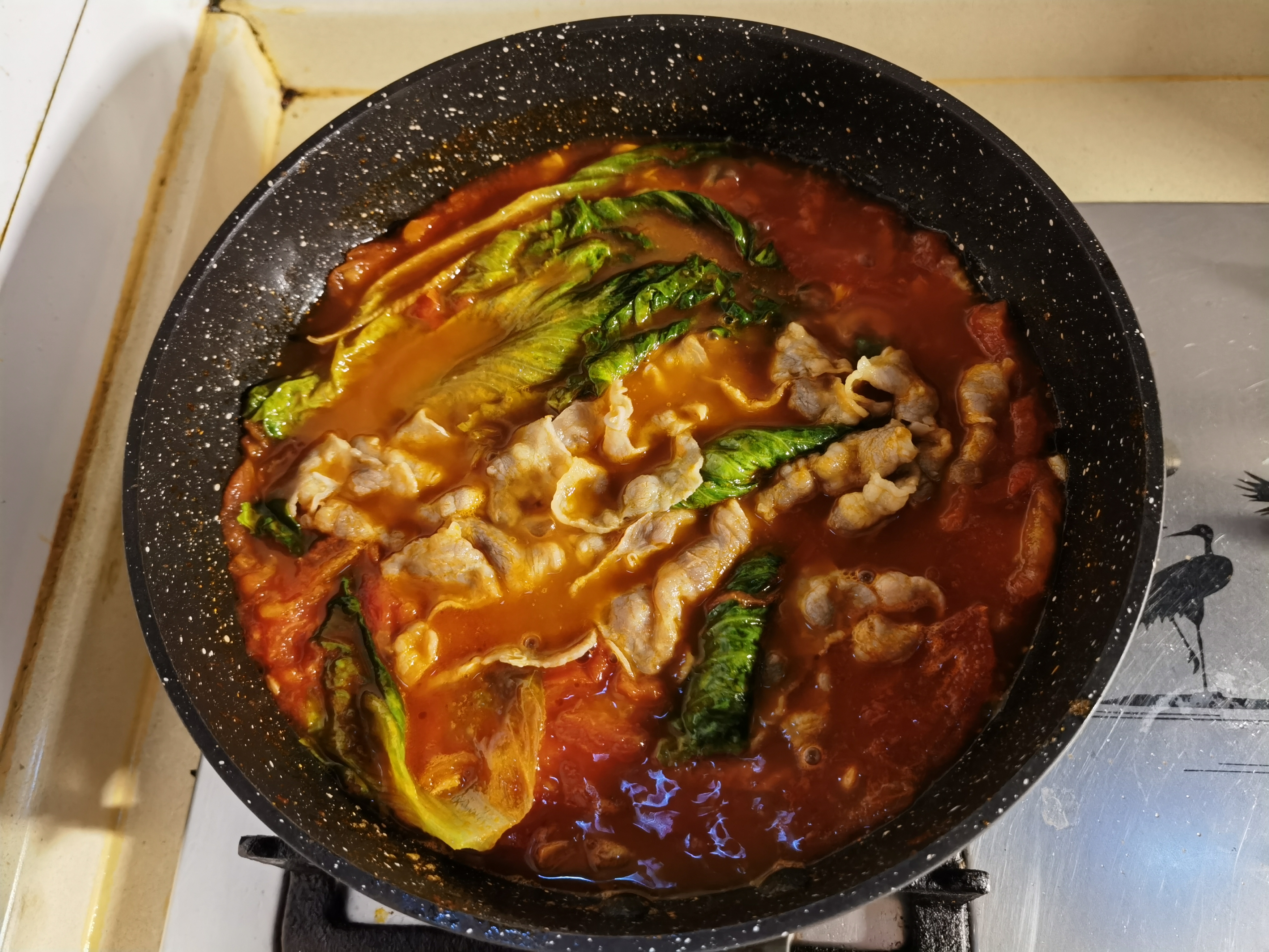 大火煮到水開後下入肥牛卷和生菜(想喫嫩一點的綠葉菜的話就晚點下菜)燜煮,等到再次水開即可出鍋,加點香菜點綴下。