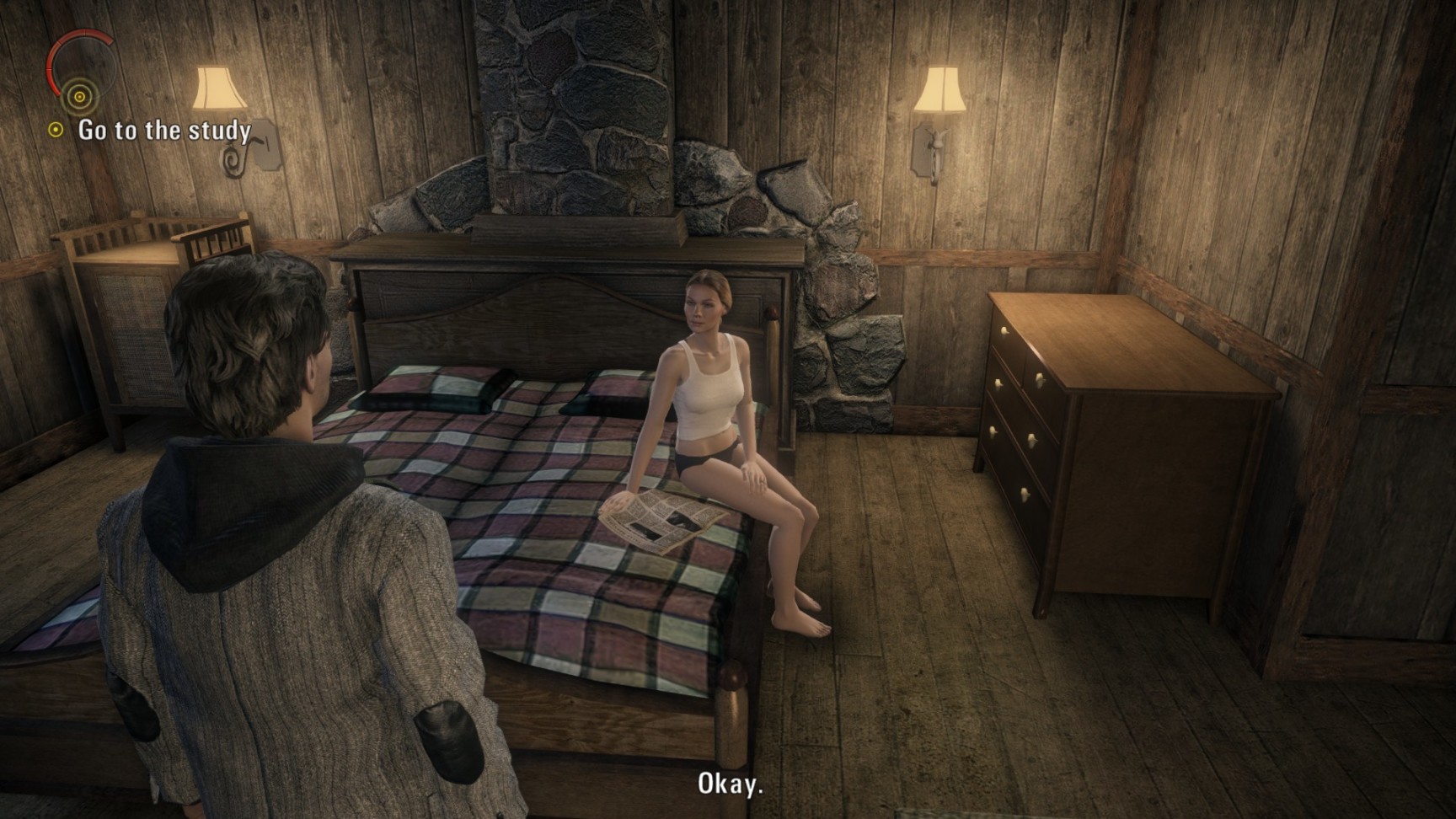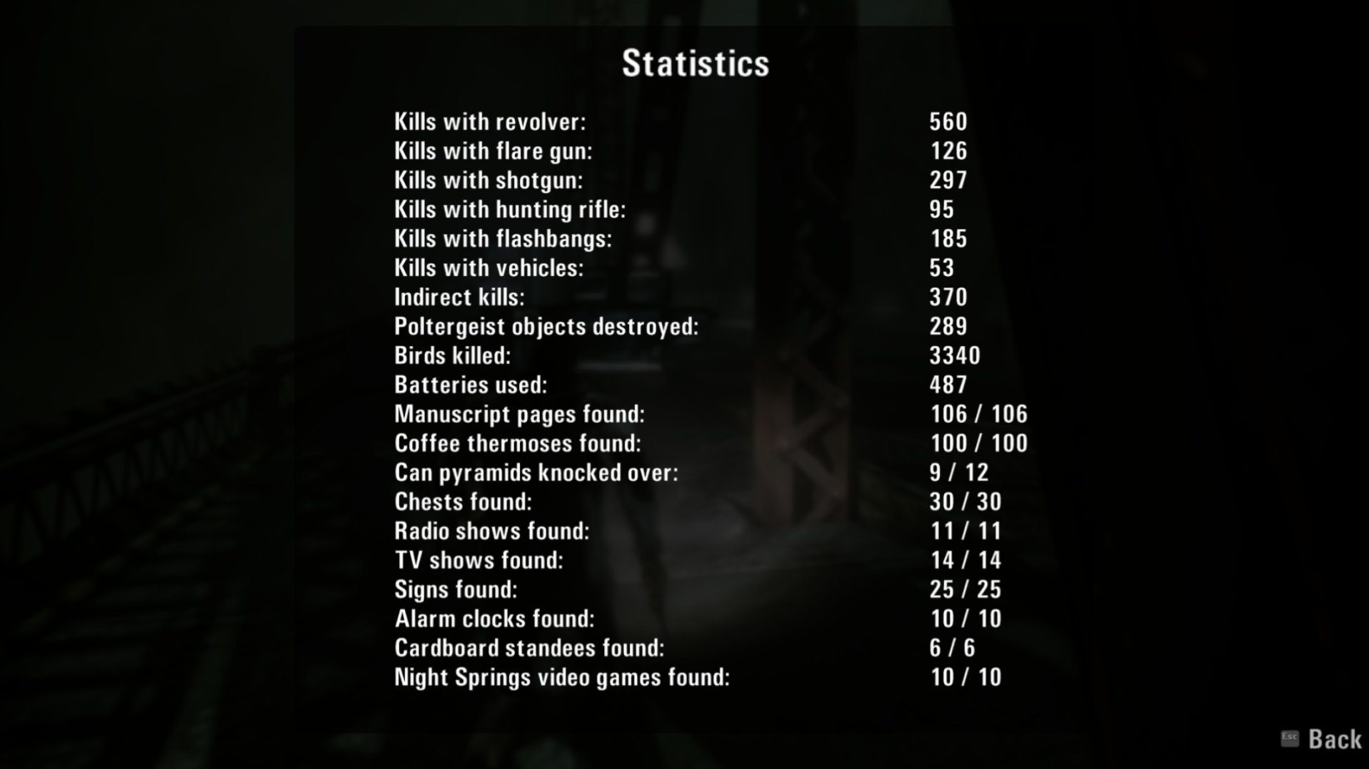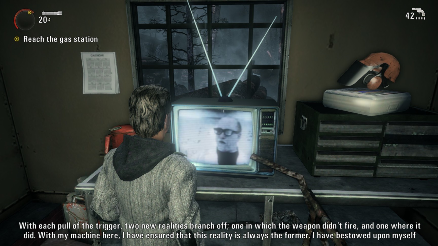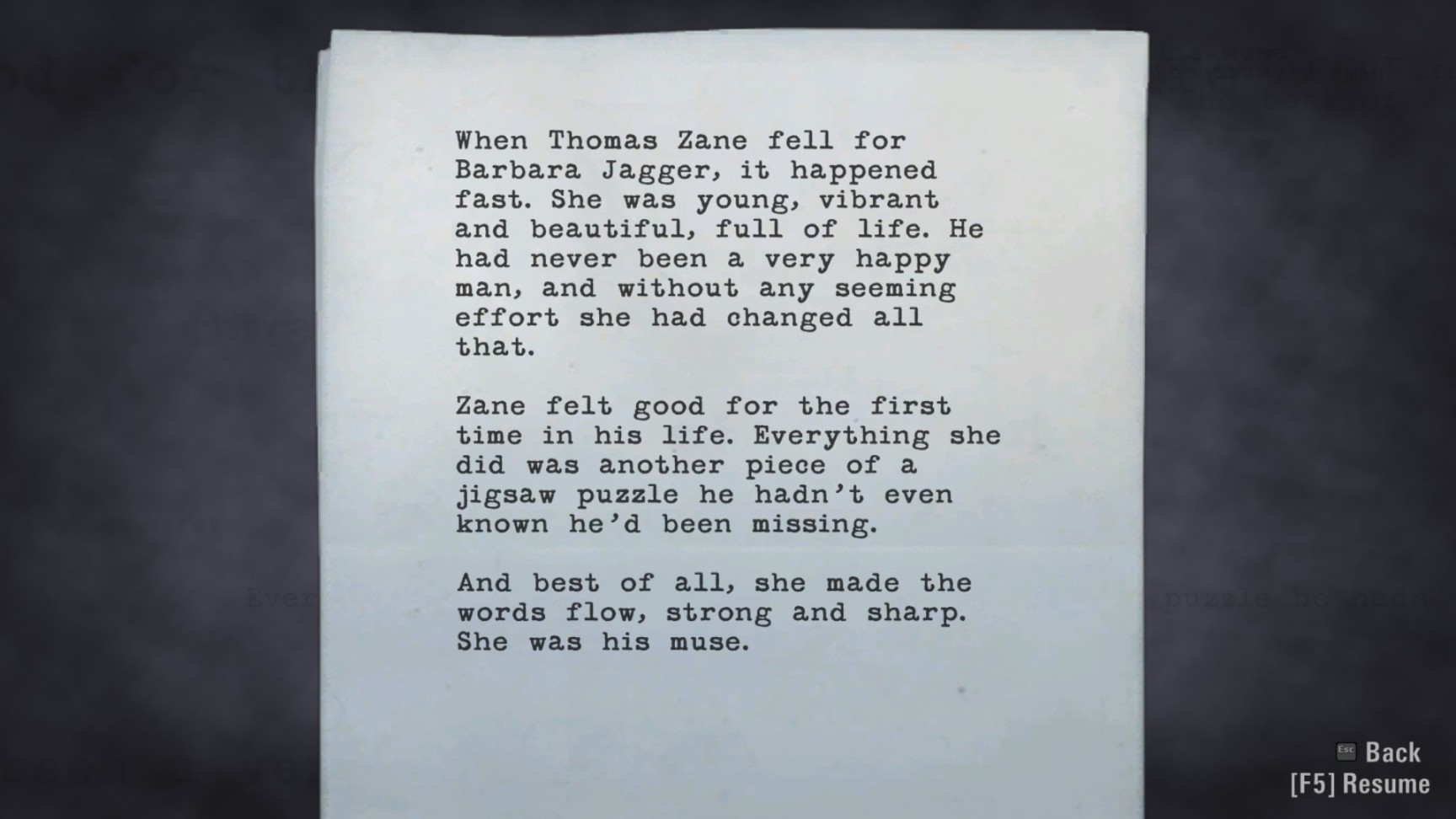“心灵杀手”里的收集品非常有意思。一种是“夜泉”电视节目,就是个磁带播放的悬疑/科幻/惊悚短片,每个节目单独成篇,强烈怀疑设计这些内容的开发者看过不少"X档案“,风格太像了,就是这种”90年代肉眼可见特效有限的科幻片+复古片头“。另外一种收集品是作家Alan的手稿,会提示一些之后剧情将要发生的事件。我英文语言玩的,很明显感觉到这些手稿内容,也就是Alan的小说风格非常类似丹布朗的小说(游戏里自己都有对白调侃了一下)。如果读过”天使与魔鬼“,”骗局点“,”数字城堡“等的读者可能会有印象,无论原版还是译版都能体会到,就是丹布朗对修辞手法使用的着迷,有时候甚至给人以滥用修辞的感觉。Alan手稿的写作手法就很相似,加上尼尔盖曼的奇幻和斯蒂芬金的悬疑惊悚风格,差不多也就是这款游戏的风味了。