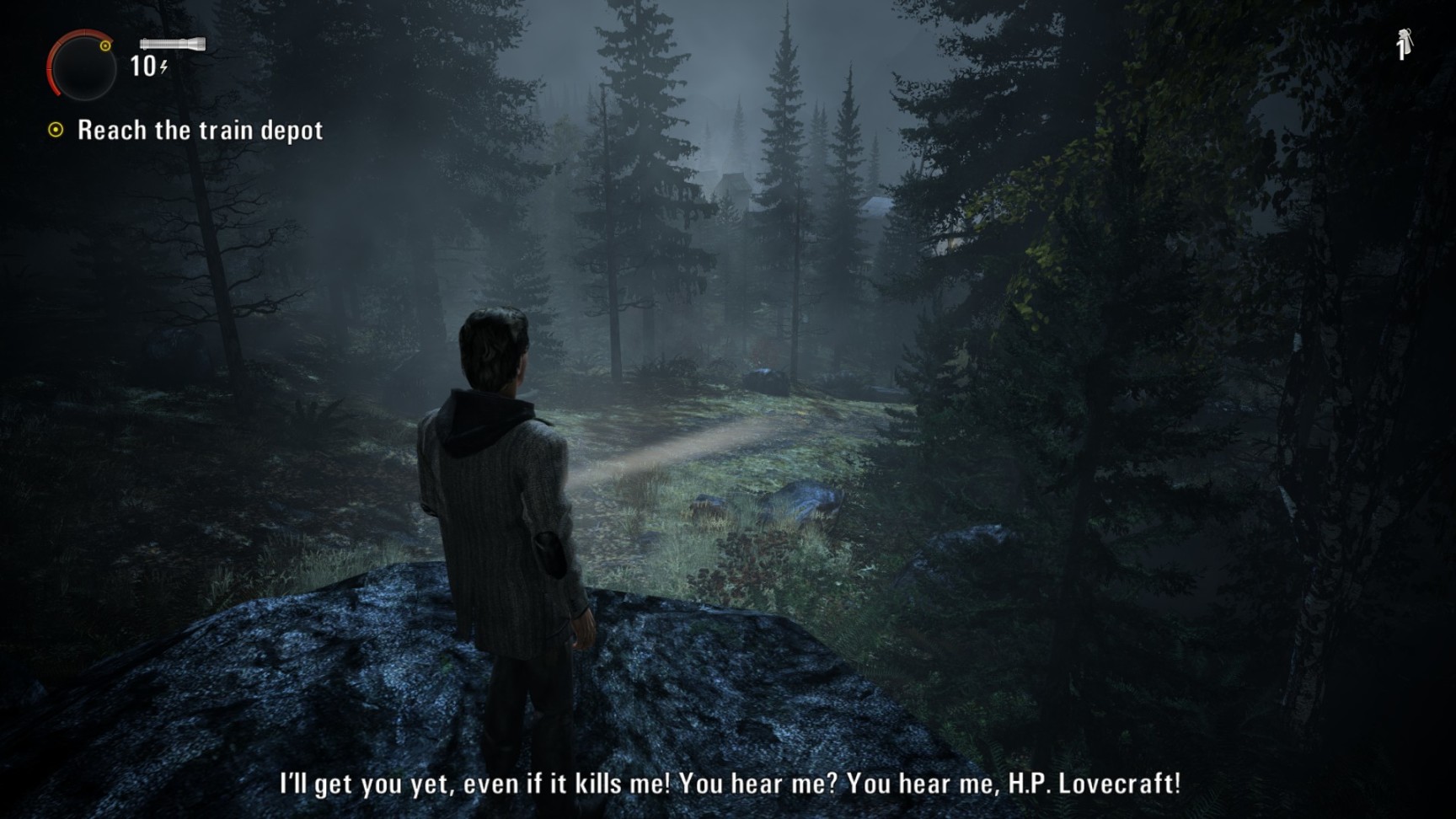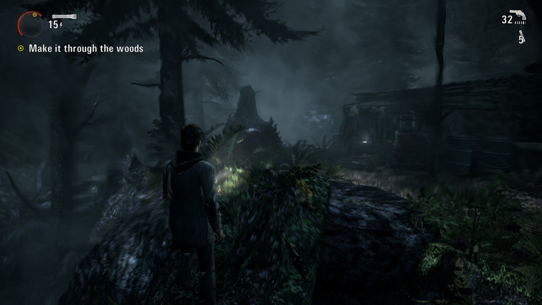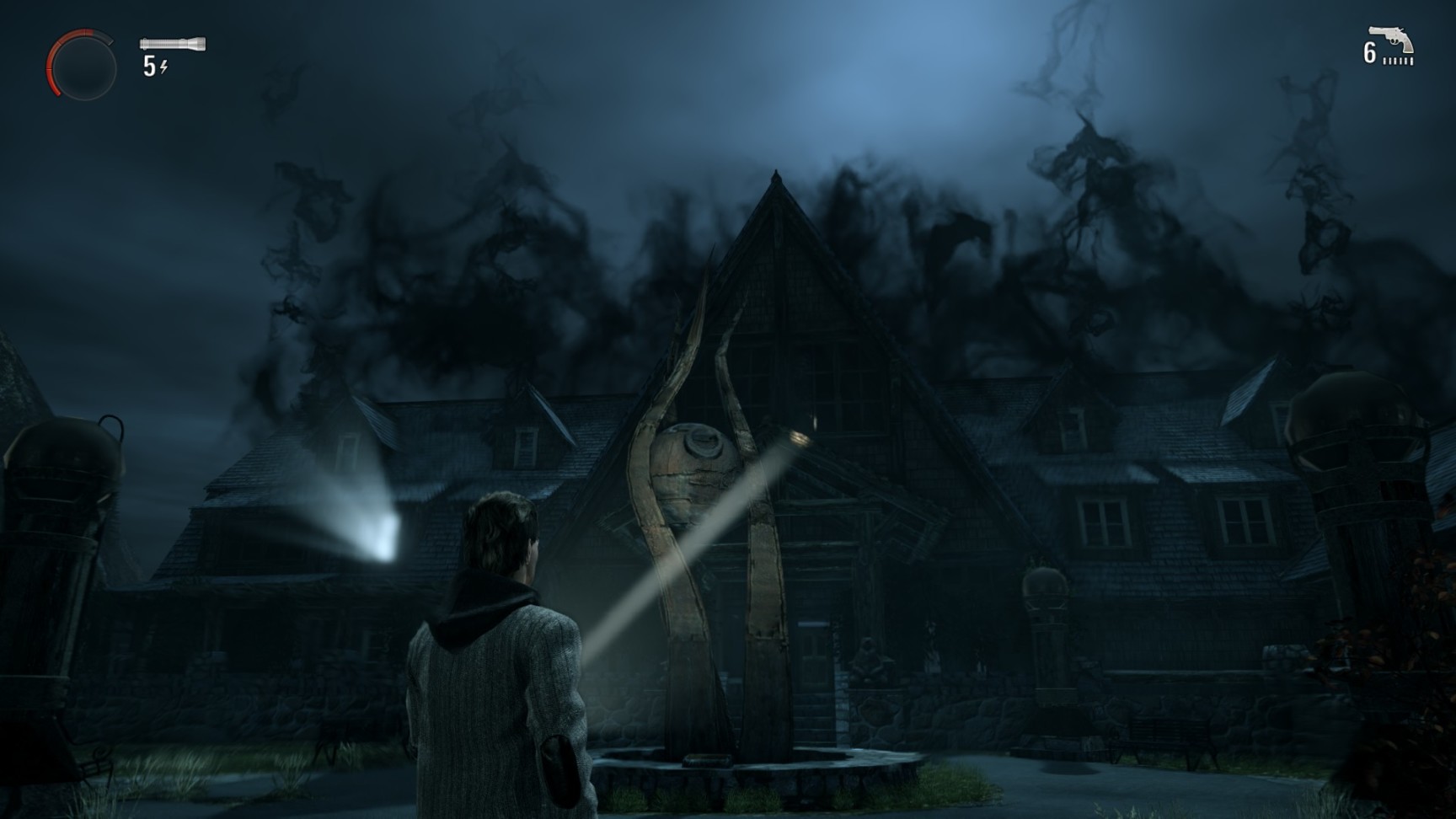 这游戏的战斗设计和大多数动作射击游戏都有点区别:没有准星,就是你的手电筒指哪打哪,感觉还是比较容易的。大部分敌人是被称为“Taken”,只在夜间活动的类人怪物。武器直接射击能打出硬直但是没有伤害,需要手电照射至驱散黑暗,才能用枪将其击杀。因此手电(以及所有能发强光的东西,包括汽车大灯)在“心灵杀手”里是重要的战斗道具,而闪光弹就充当了其他游戏中手榴弹的作用。此外还有能驱散敌人的冷焰火,被包围时非常好用。手电拧高亮度照射敌人时时会消耗电量,电池消耗之后会自动充电,但是在激烈的战斗中往往需要手动更换电池。在高难度下我自己玩的时候电池用的比较省,很多战斗能跑就直接跑过去不打。游戏里的路灯光源被称为“safe heaven”避风港,主角能在路灯下回血。敌人是进不来的,因此被追击时拼命赶到路灯下,紧张的配乐一扫而光,近在眼前的敌人也化作黑烟消散了,非常安心。除此以外战斗机制并不复杂,没有武器升级或是角色的什么升级。