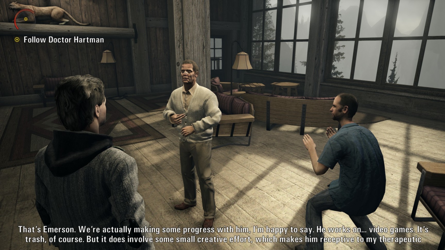 剧情就是作家Alan Wake虚虚实实的历险,我在游玩过程中想到的是斯蒂芬金和丹布朗小说的融合,尤其是后者。如果比作美剧的话,有“双峰”的风格。我个人觉得它的剧情质量要高于Remedy另外俩”控制“和”量子破碎“。“心灵杀手”的剧情紧凑程度和“达芬奇密码”,“数字城堡”这些我小时候读过的小说类似,故事发生在游戏里的一周之内,张弛有度。除了夜晚场景的战斗之外,也有一些白天场景让玩家缓一缓。它的章节设置类似于美剧,每一章节开始前有个剧情回顾的前情提要。
