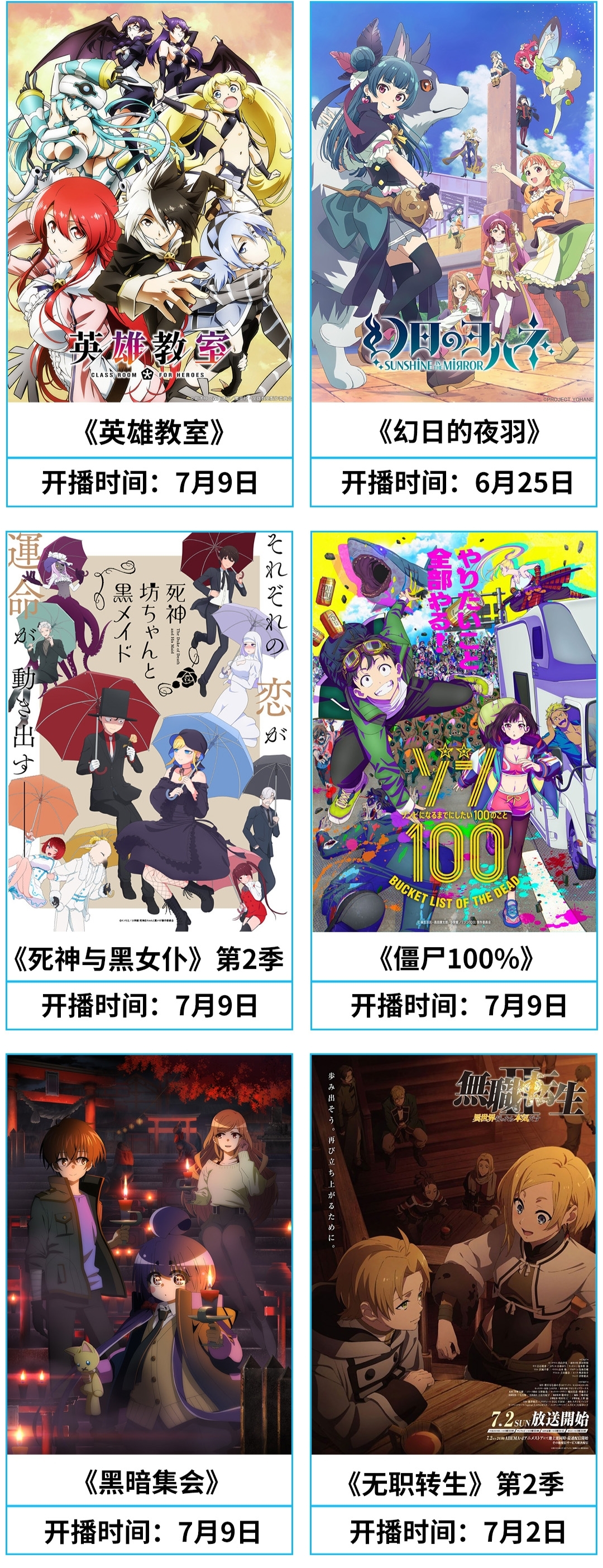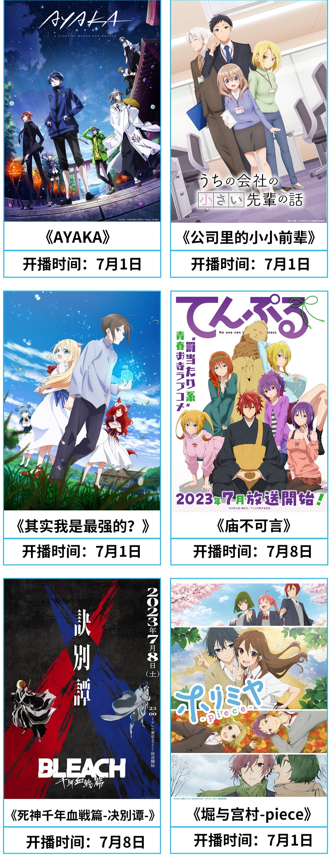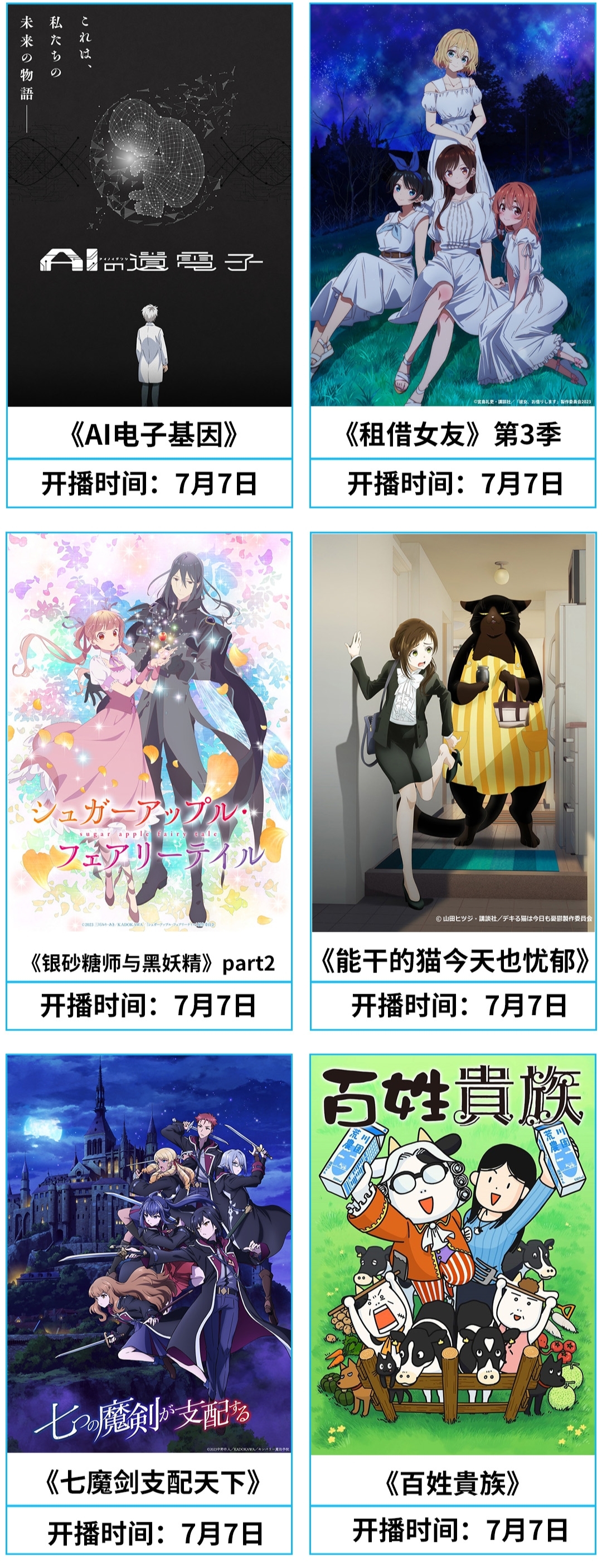 7月新番的數量相較於4月絲毫沒有減少,續作方面有《死神-千年血戰篇》、《咒術回戰2期》《堀與宮村piece》、《租借女友3期》和《無職轉生2期》迴歸。