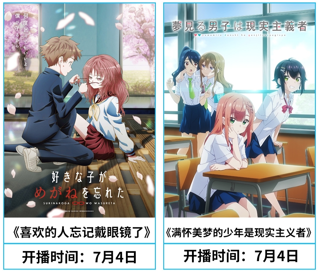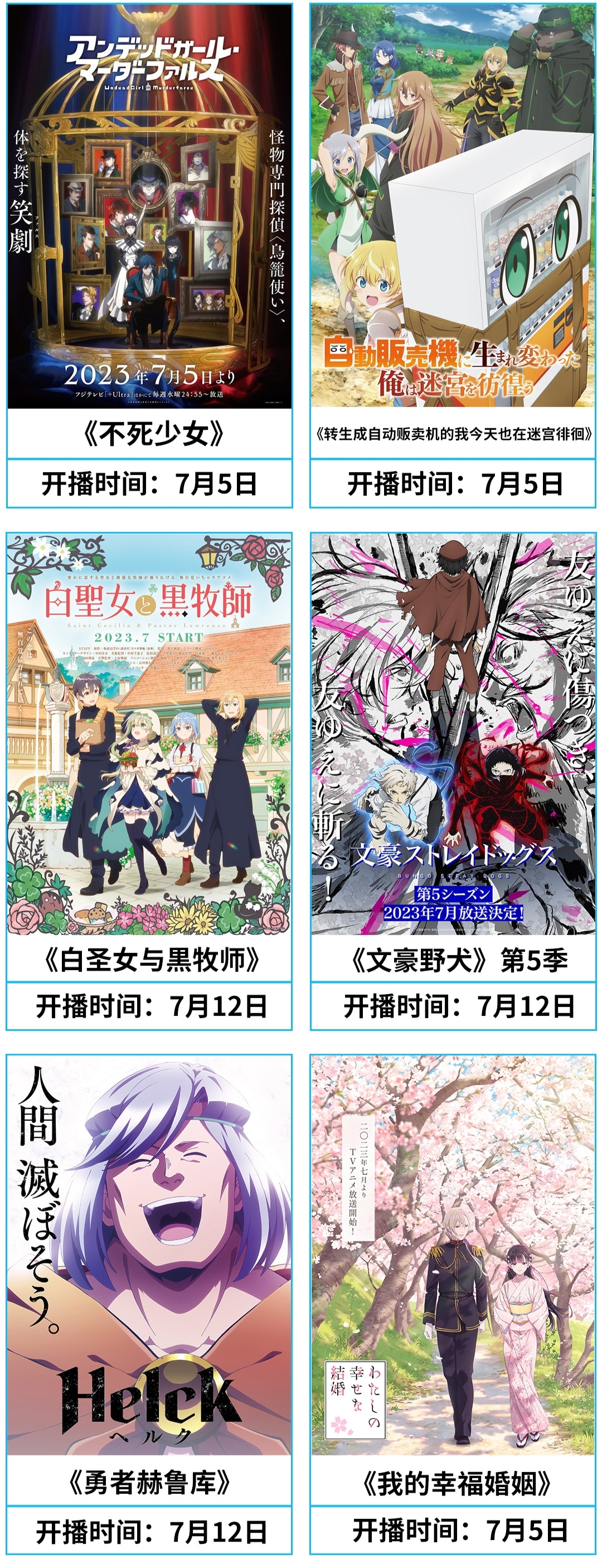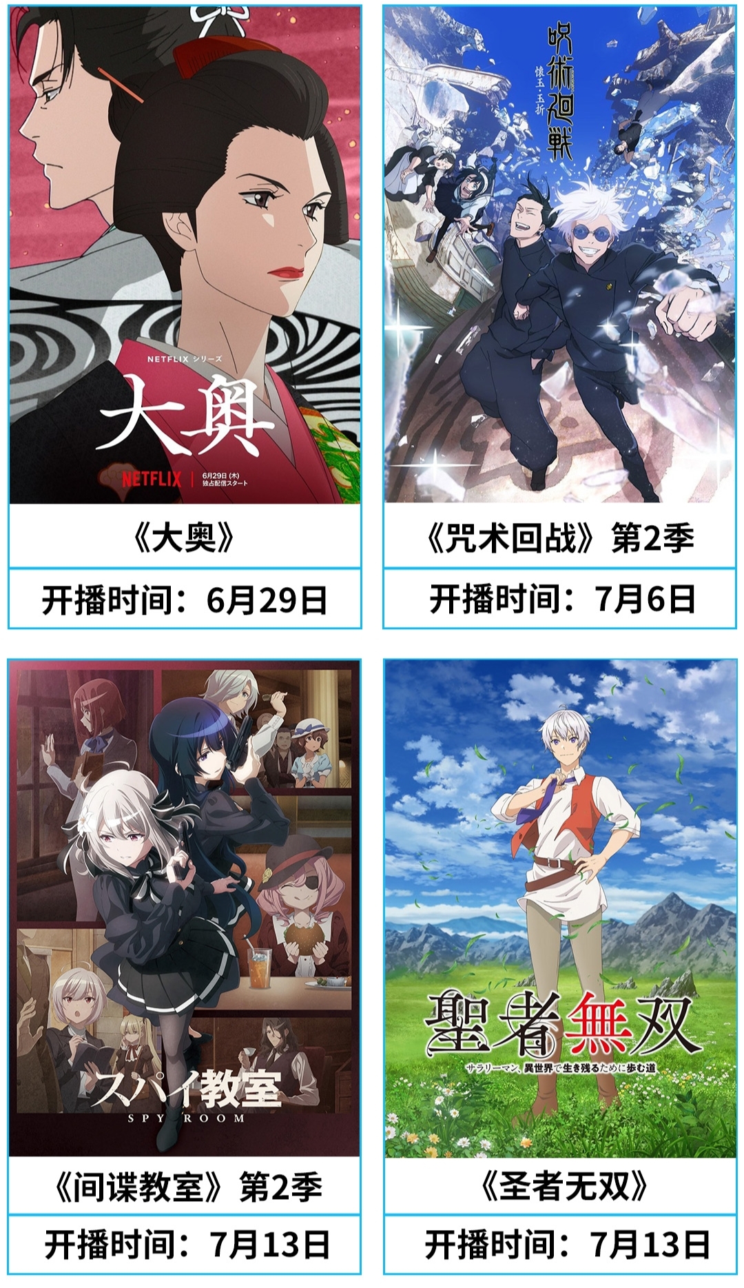 7月新番的數量相較於4月絲毫沒有減少,續作方面有《死神-千年血戰篇》、《咒術回戰2期》《堀與宮村piece》、《租借女友3期》和《無職轉生2期》迴歸。