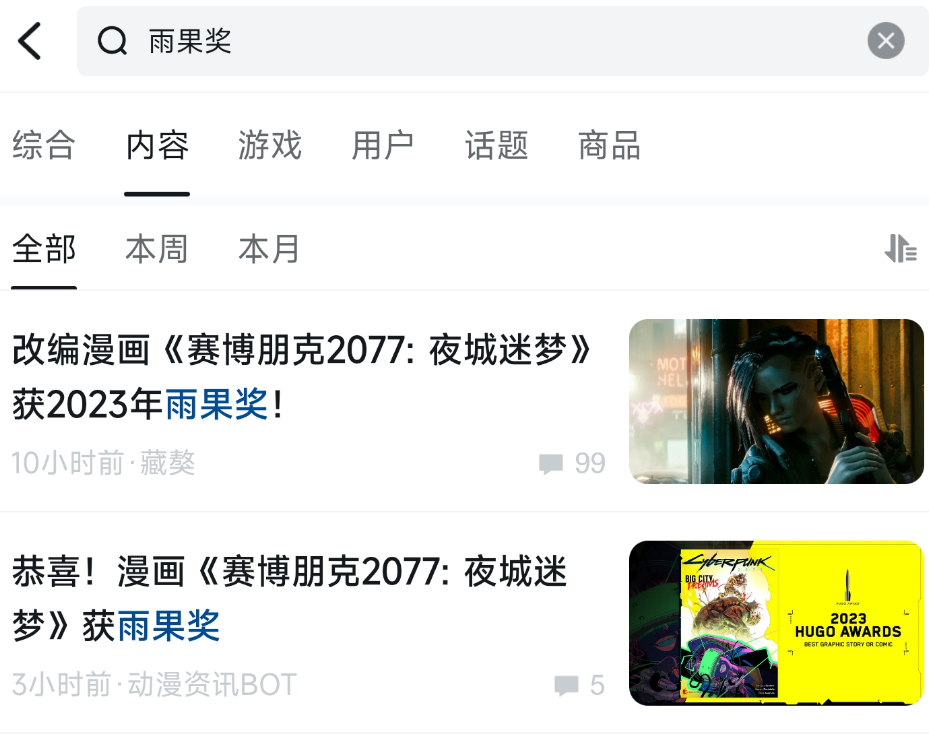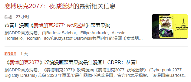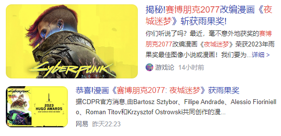 打開中文搜索引擎,搜索關鍵字“賽博朋克2077:夜城迷夢”,可以看到大量的醒目標題,“揭祕!賽博朋克2077改編漫畫《夜城迷夢》斬獲雨果獎!”,“恭喜!漫畫《賽博朋克2077: 夜城迷夢》獲雨果獎。”
