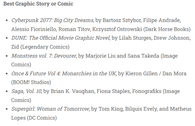 以上我發現這個烏龍的心路歷程也很搞笑,最初本來打算介紹一下今年雨果獎的入圍名單,但是在寫的過程中,突然想起好像在xhh上看到了2077獲得雨果獎的消息,但我搜集到的只有2077和沙丘等改編漫畫入圍的信息,並沒有獲獎消息;再回頭在中文互聯網上搜索,才發現全網都是烏龍假消息。