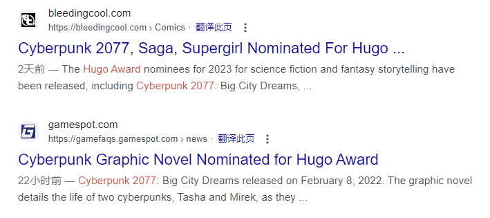 在中文互聯網大量搜索後,找不到這則獲獎信息可靠的來源,於是簡單用英文搜索“Cyberpunk 2077”和“Hugo Award”,可以看到知名遊戲媒體Gamespot報道了這則消息,但他用的詞是“Nominated”,前面知名漫畫網站血酷Bleedingcool同樣也是醒目的“Nominated”。