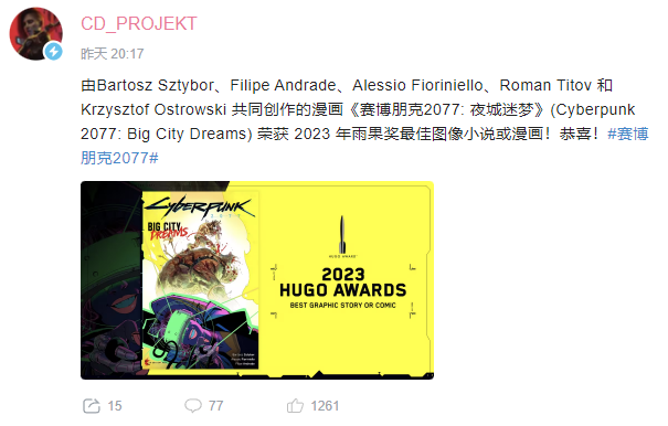 由Bartosz Sztybor、Filipe Andrade、Alessio Fioriniello、Roman Titov 和 Krzysztof Ostrowski 共同創作的漫畫《賽博朋克2077: 夜城迷夢》(Cyberpunk 2077: Big City Dreams) 榮獲 2023 年雨果獎最佳圖像小說或漫畫!恭喜!