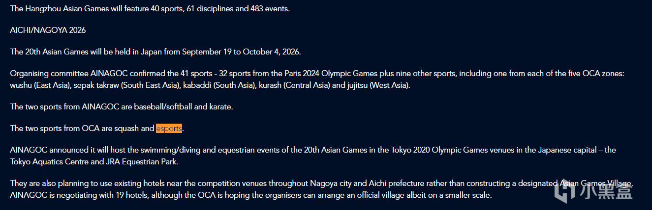 第20届亚运会将于2026年9月19日至10月4日在日本名古屋举行。据悉,日本爱知・名古屋亚组委确认了 41 个大项,包含 2024 年巴黎奥运会的 32 个大项以及其他 9 个大项。其中电子竞技由亚奥理事会推荐入选。