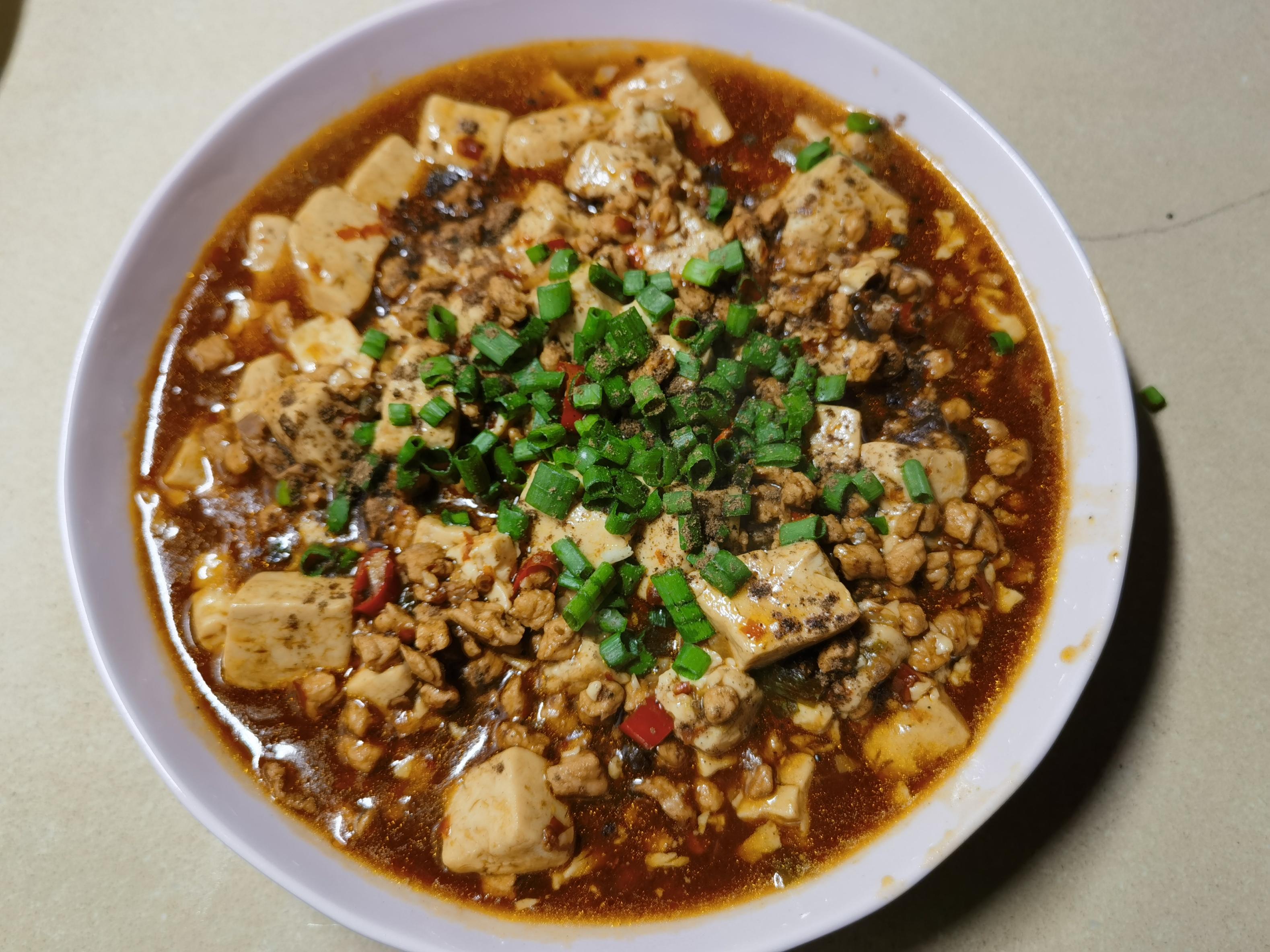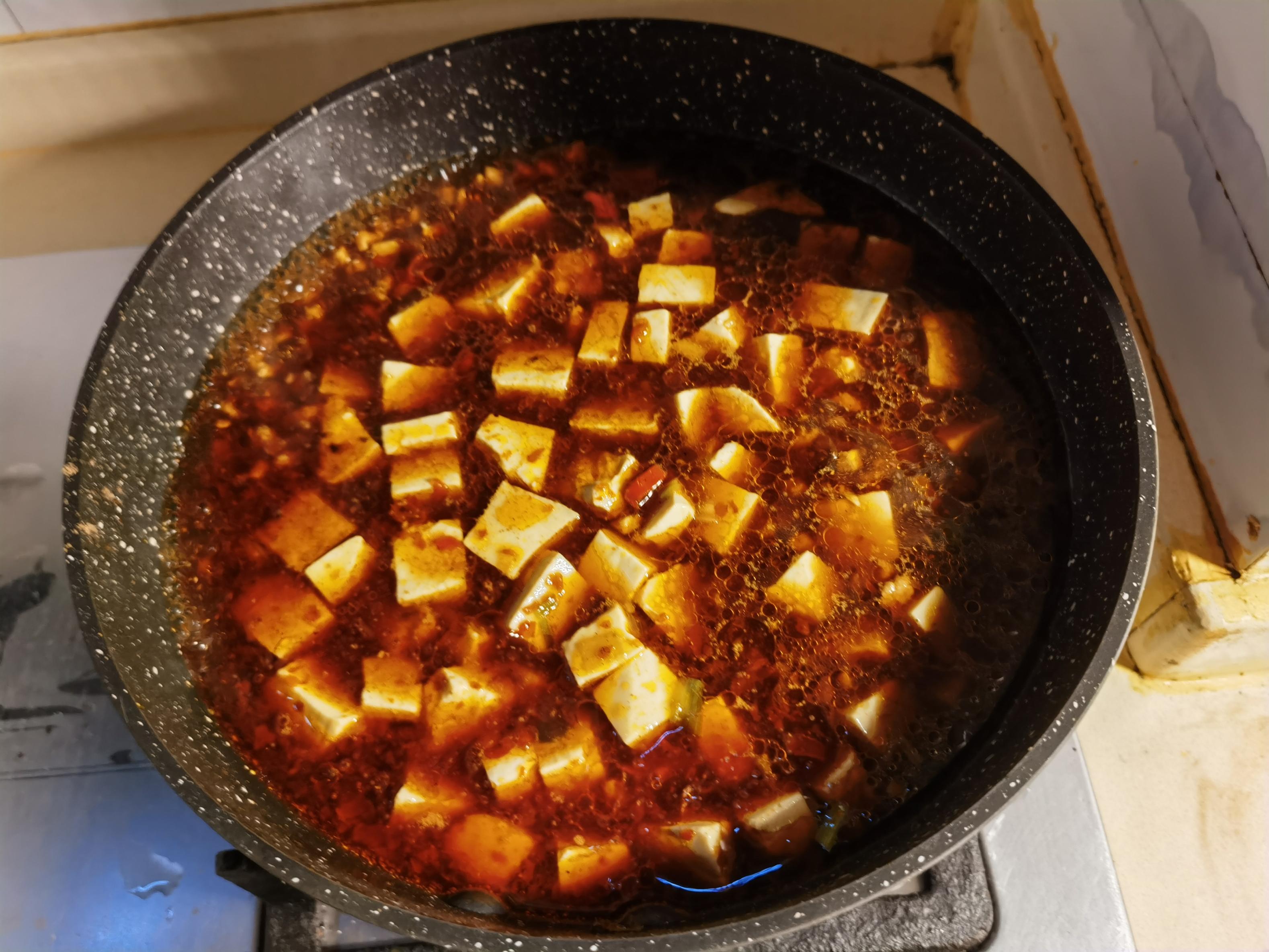 加入嫩豆腐,大火煮開後開中小火燜煮5 min,揭蓋收汁,可以在汁水快收好時加點水澱粉勾芡,出鍋,再均勻撒上點胡椒粉,加入蔥綠點綴。