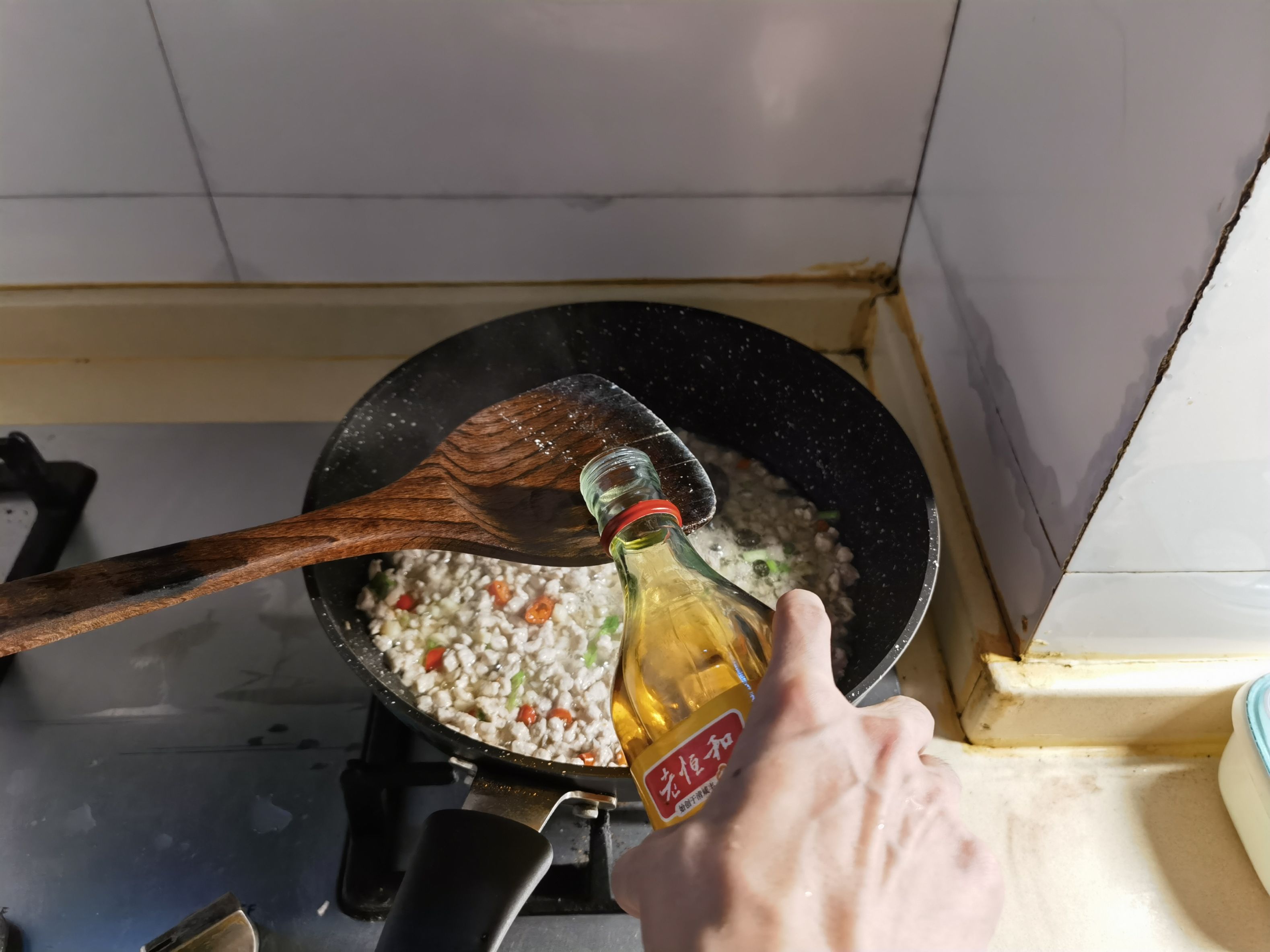 將肉炒至看不見血色後再加入蔥蒜辣椒圈繼續翻炒,炒出香味後加入五勺料酒(勺子大小見圖),加入料酒後再繼續保持中火炒上20 s,肉炒幹一點沒關係,
