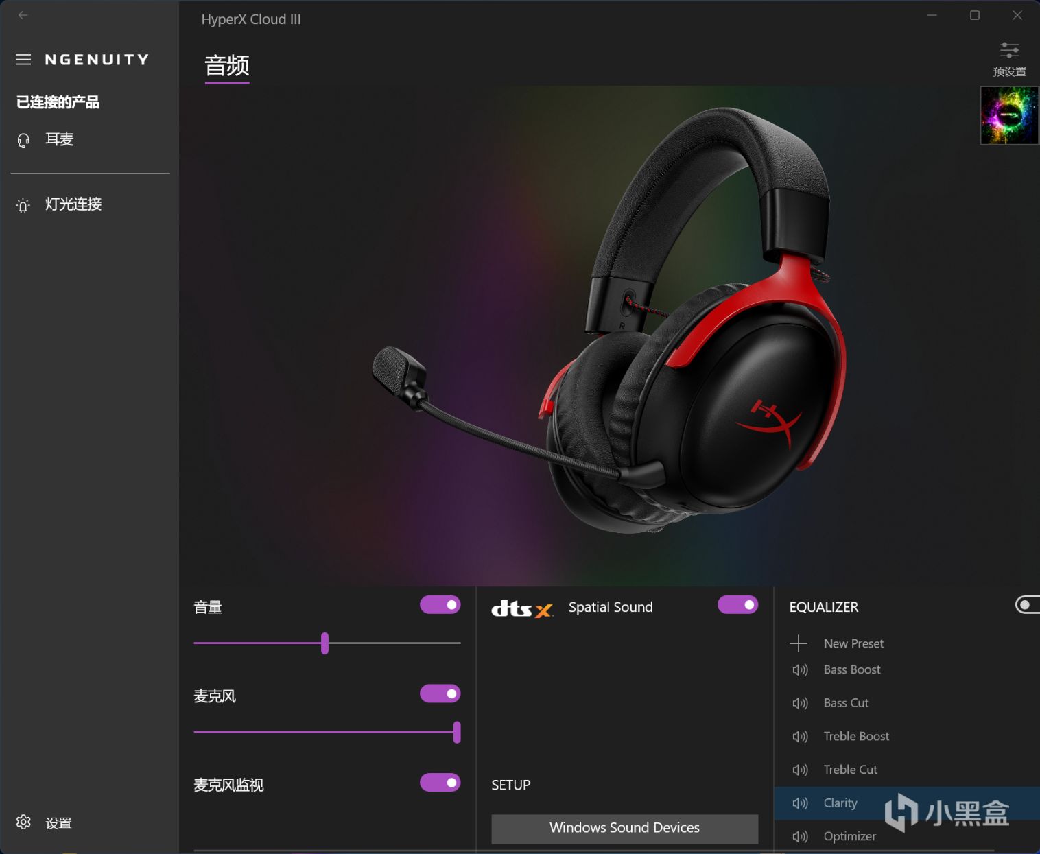 配套的HyperX NGENUITY軟件可以在Microsoft Store中下載,軟件容量小界面清爽直觀,可以設置音量、麥克風、麥克風監視、DTS Headphone:X空間音效和多種EQ模式,軟件也是和其他一些HyperX產品通用的,玩家用起來更舒心。