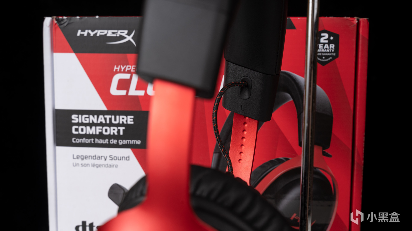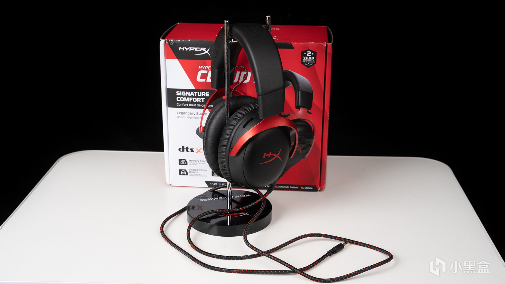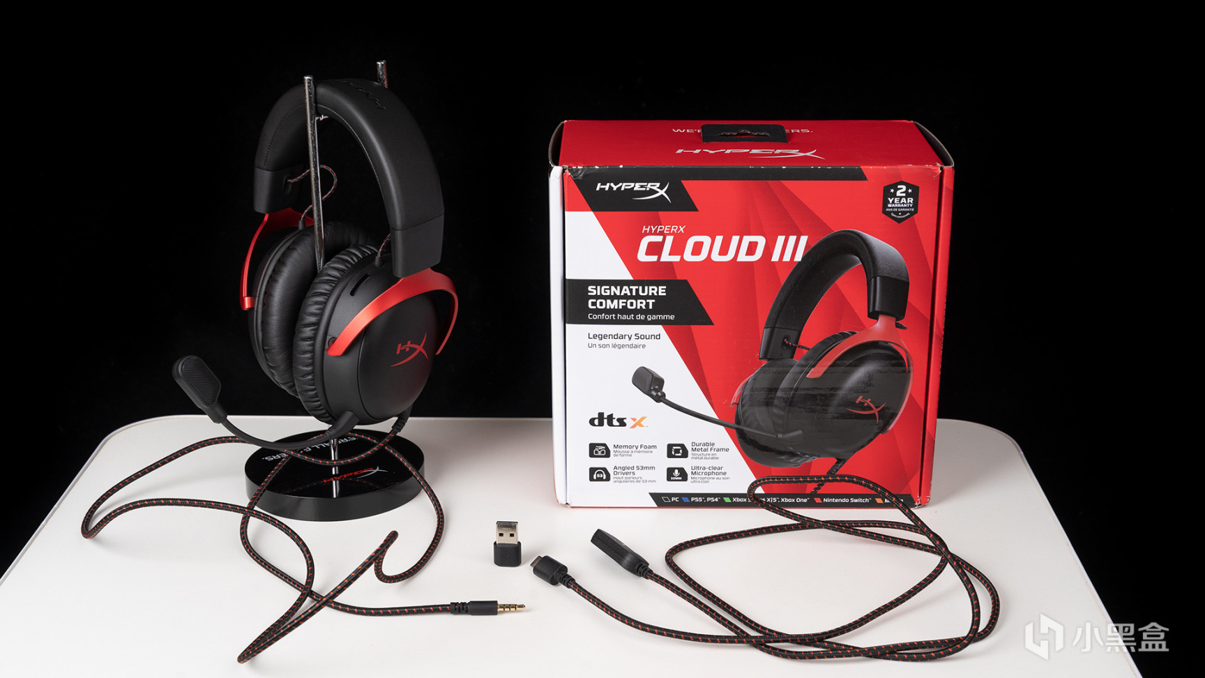颶風3的包裝,延續了HyperX家族經典的紅白配色,正面有颶風3本體的渲染圖,名稱和賣點全是用英文標註的,下方標註支持PC、PS4、PS5、Xbox Series X|S、Xbox One、Nitendo Switch以及移動設備多平臺兼容,右上角則是兩年質保售後的LOGO註明。