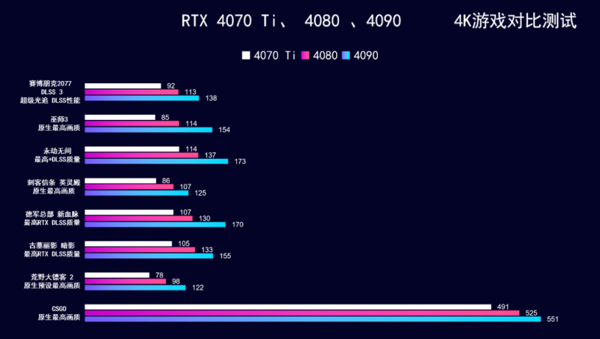 作爲對比,遊戲不開光追 DLSS,A卡RX 7900XT強於4070Ti,弱於4080