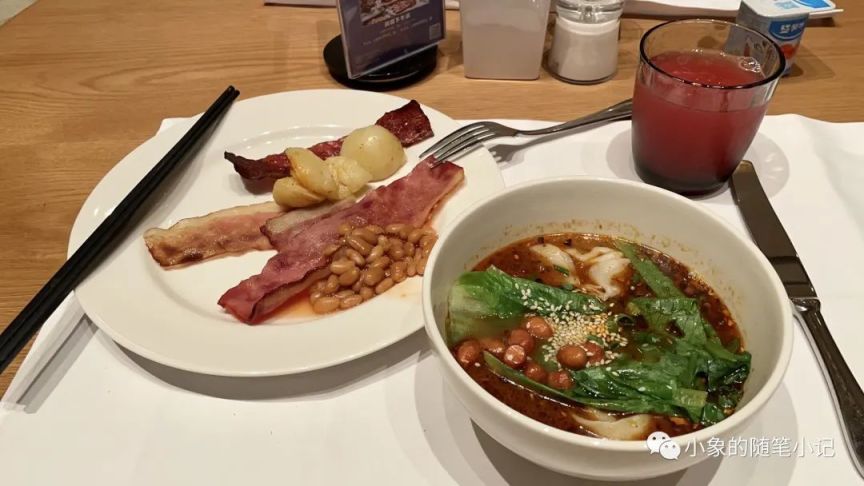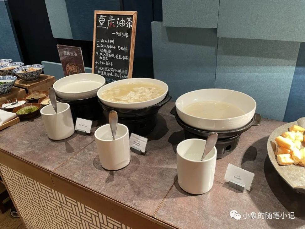 睡醒起來,就該聊聊酒店的自助早餐了——臨時增加一份早餐的價格是¥148/人/天,倘若事先預定,那麼便是¥108/人/天,屬於正常的價位水平——早餐位於凱悅酒店的八號廚房(難道是因爲在酒店八樓就叫八號廚房?)。大廚現做的熱食檔有重慶特色的小面、酸辣粉、抄手之類,還算可口。相比起麪包甜點,主食檔只能說中規中矩,基本都是每個酒店早餐都會配備的東西。不過值得一提的是,他家的培根在煎烤的過程中分成了三個熟度,從軟嫩到焦脆都有,盡力地迎合每位賓客的口味偏好,非常細心。除此以外,還有一個櫃檯專門用來提供一個叫做“重慶油茶”的東西,很好奇,但是實在不敢嘗試,也許有讀者可以給我指點一二?