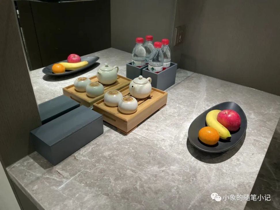 打開房門,這種感覺就愈發明顯了,唯一靚麗的色彩居然是在迷你吧上附贈的入住水果以及每日供應的免費礦泉水——農夫山泉的紅色瓶子——這些居然是第一眼吸引到我的東西。房間並不算大,不到50平,但由於其簡約冷淡的裝潢,實際感覺也不算小,進門右手邊是衛生間,是用完全的牆體與客房做的隔斷,就是典型的舊生代房間設計思路,並不值得太多說道。