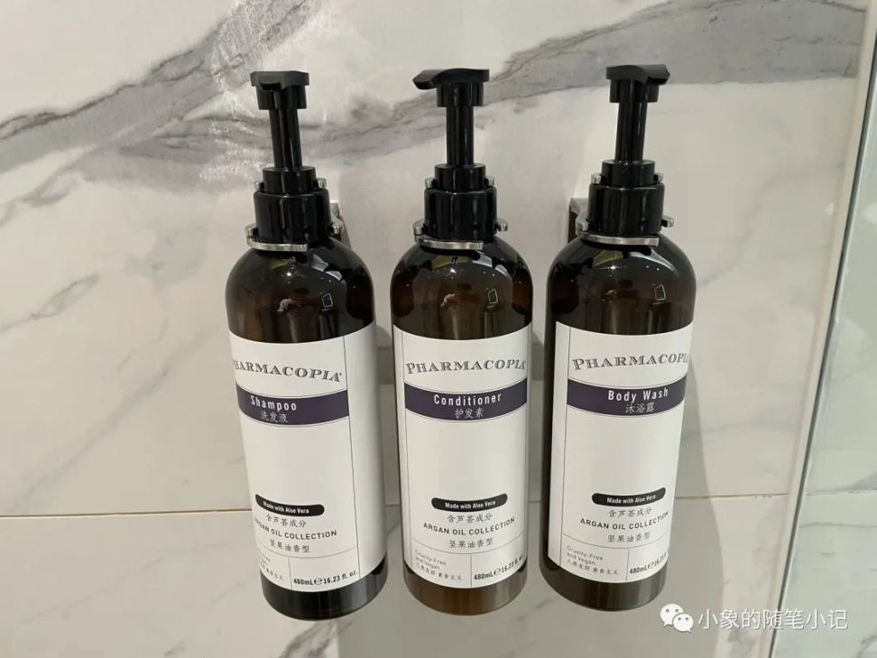 盥洗室進門左手邊是淋浴間和浴缸,右手邊是座便器,正對面是洗漱臺。由於淋浴和浴缸被放在了一個地方,所以整個衛生間有很大一片空間空置,寬衣解帶甚是方便。浴室的備品是Pharmacopia,法瑪可雅,整體的調香都是堅果油香,第一次使用會覺得帶點生薑味,蘆薈清香並不多,整體的包裝和調香都挺有意思的,不過也是大瓶裝,薅不了小瓶的羊毛了。不過淋浴還有一個小細節值得注意,淋浴間的花灑是隻有一個移動噴頭,而無固定的大花灑噴頭,所以並不能感受到很好的淋浴體驗。
