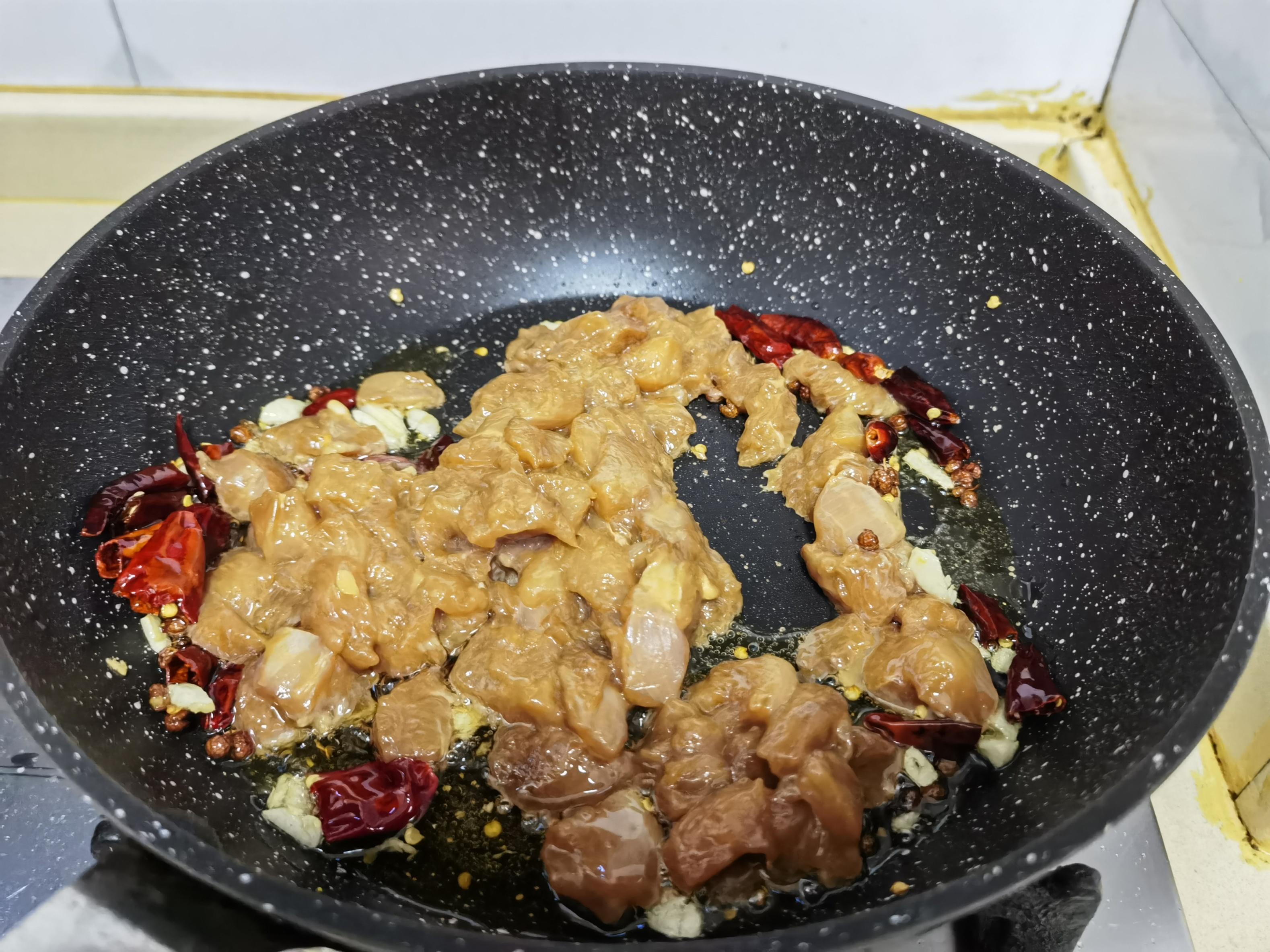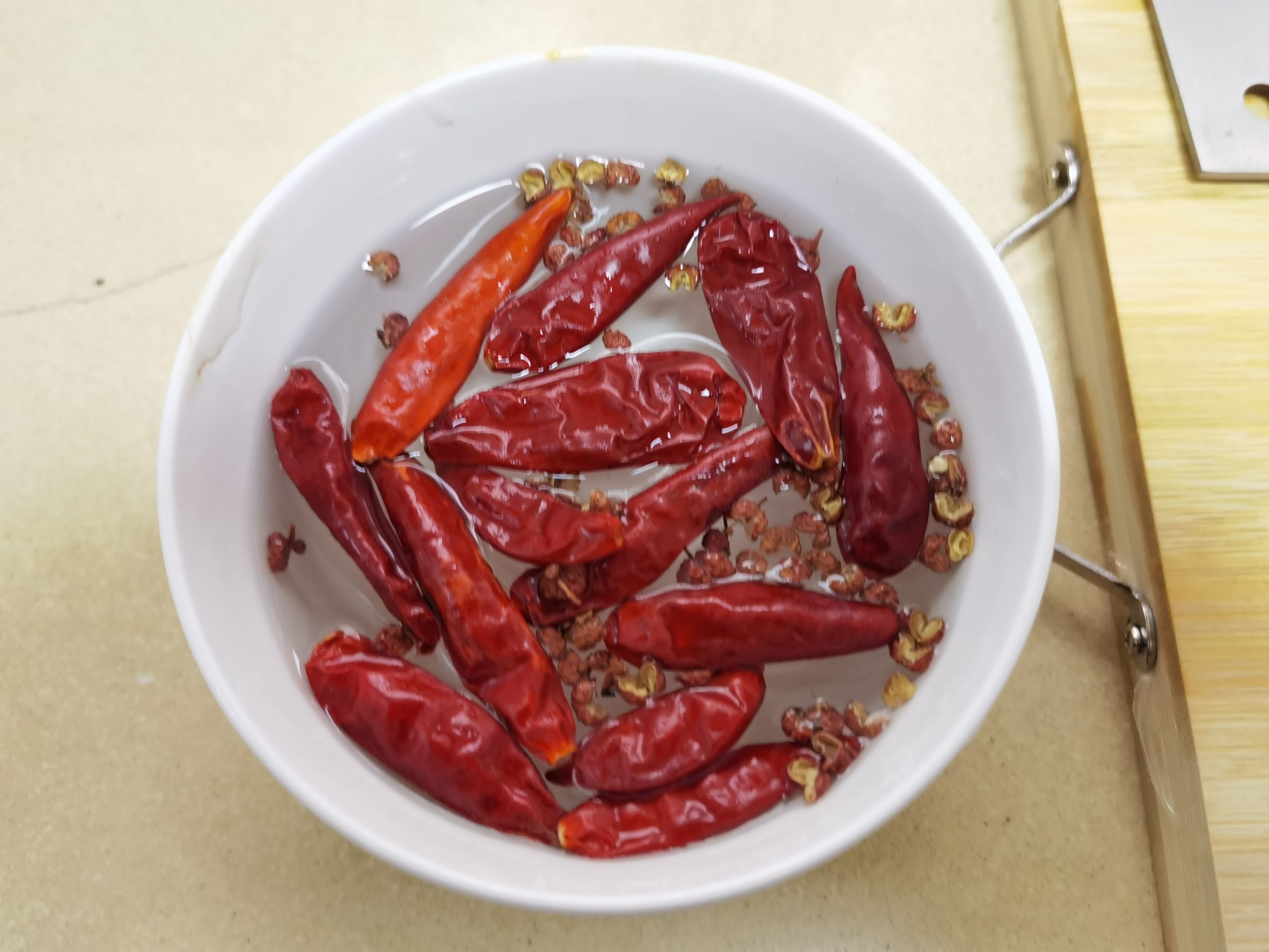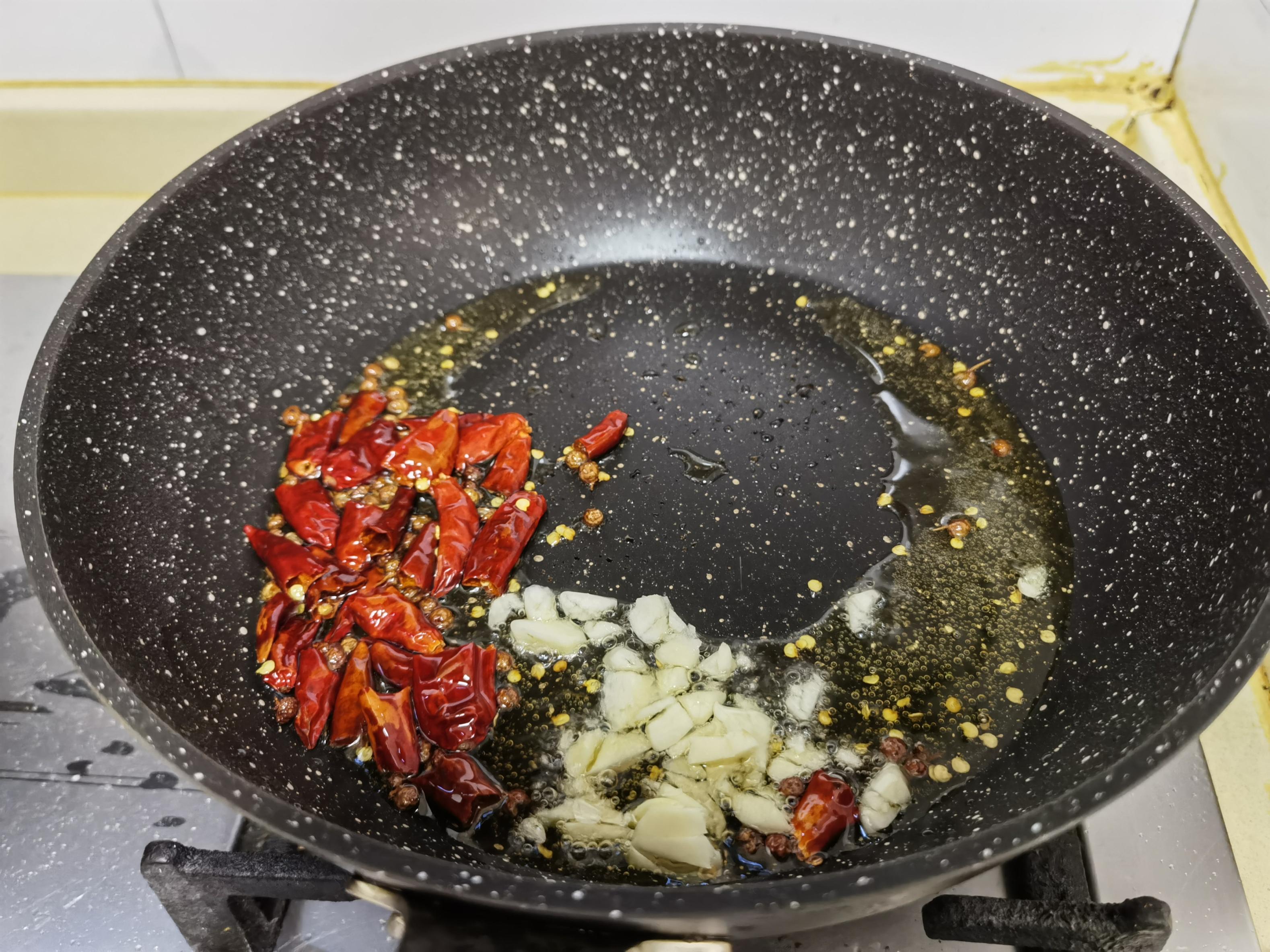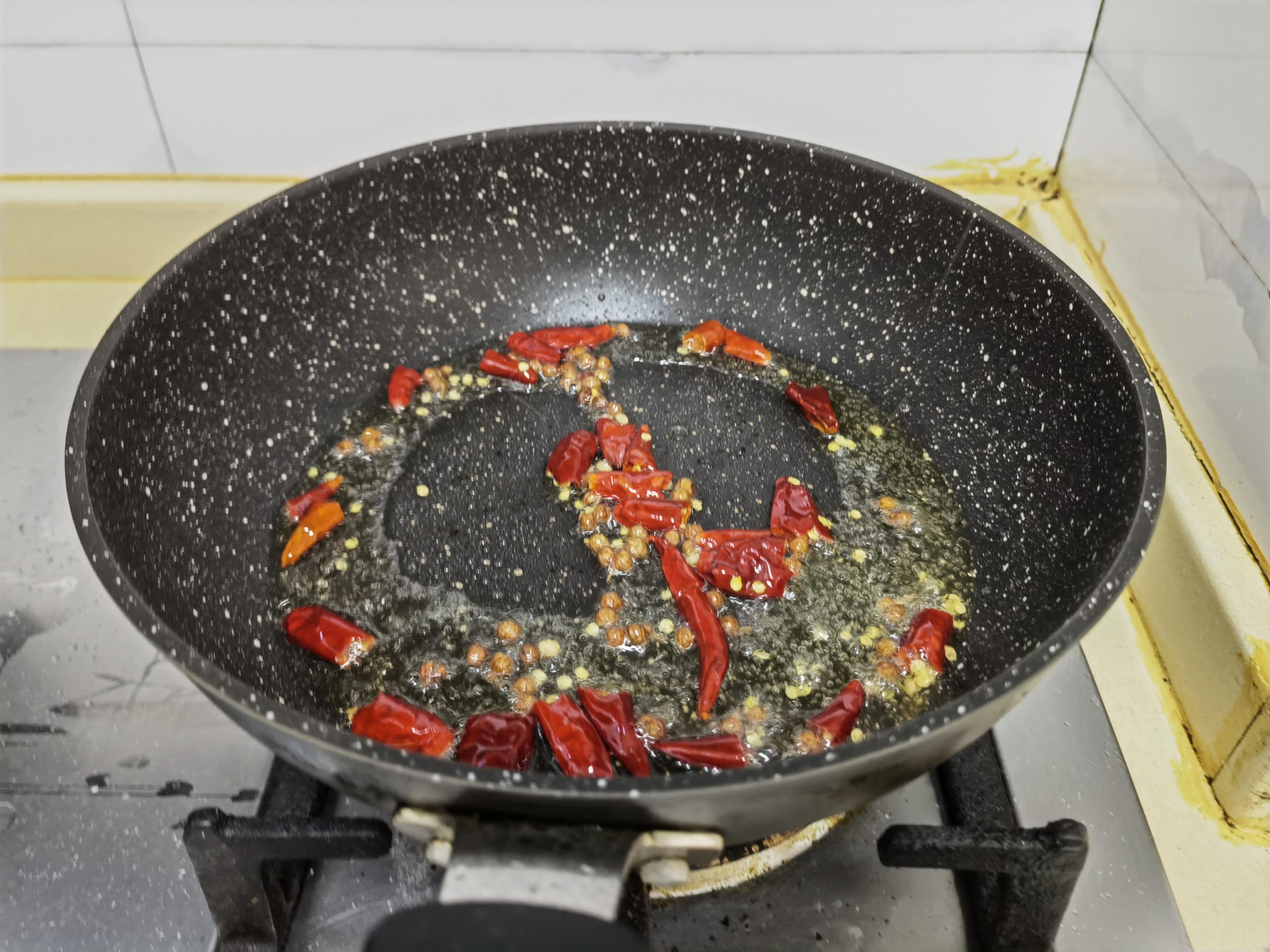 油熱至四成熱即下入提前瀝乾水分的幹辣椒和花椒,中火炒出香味,大約15 s,