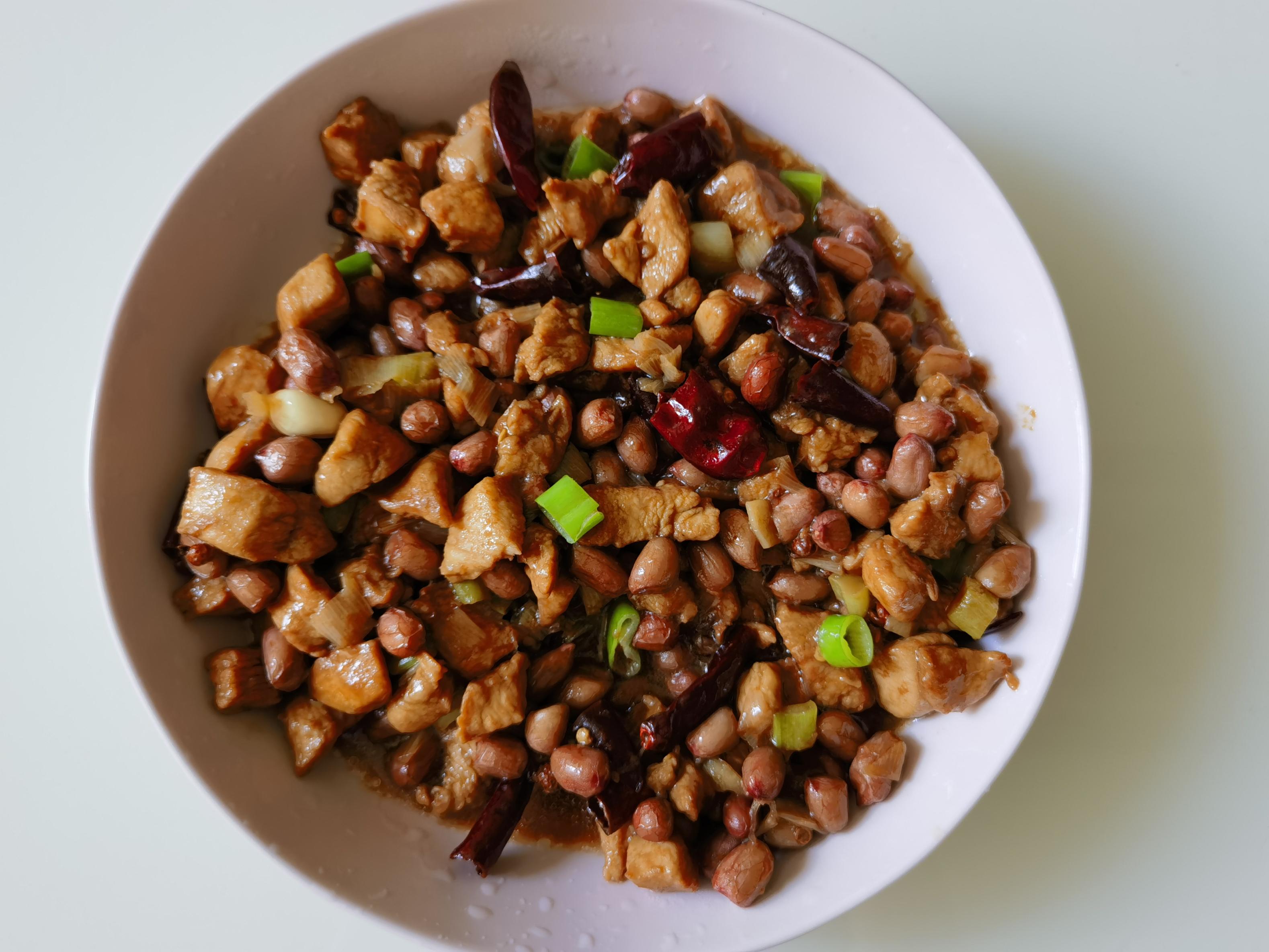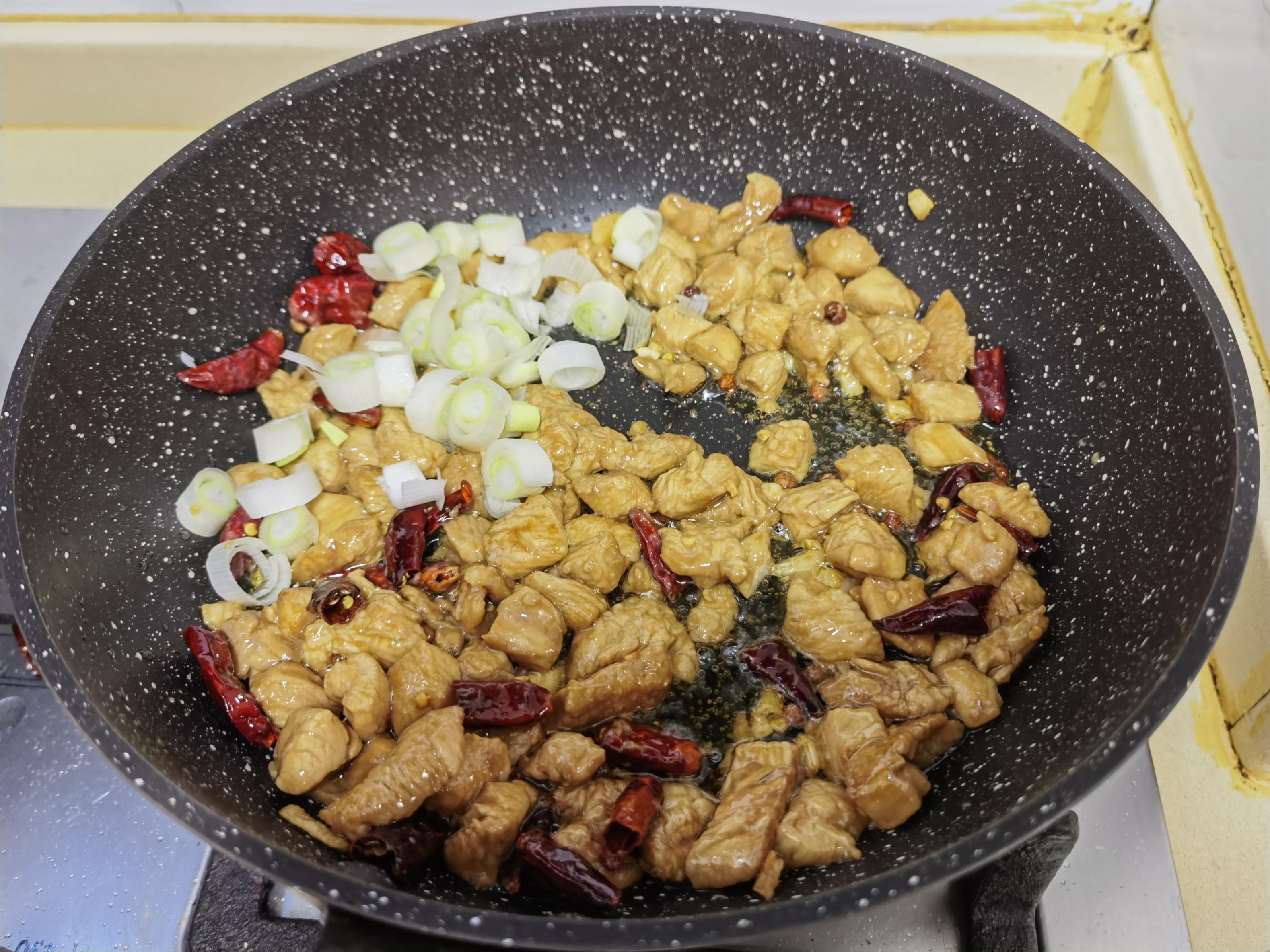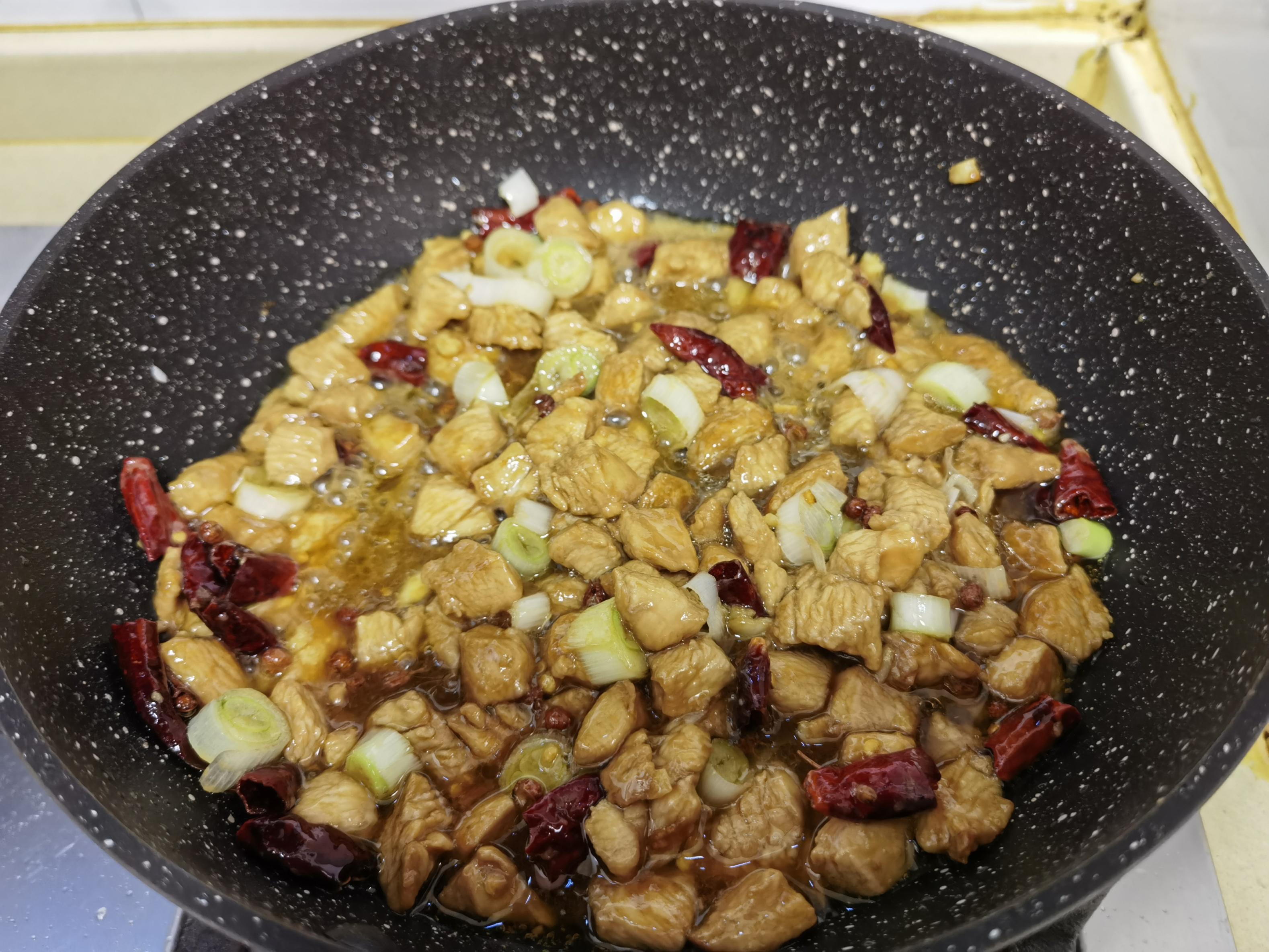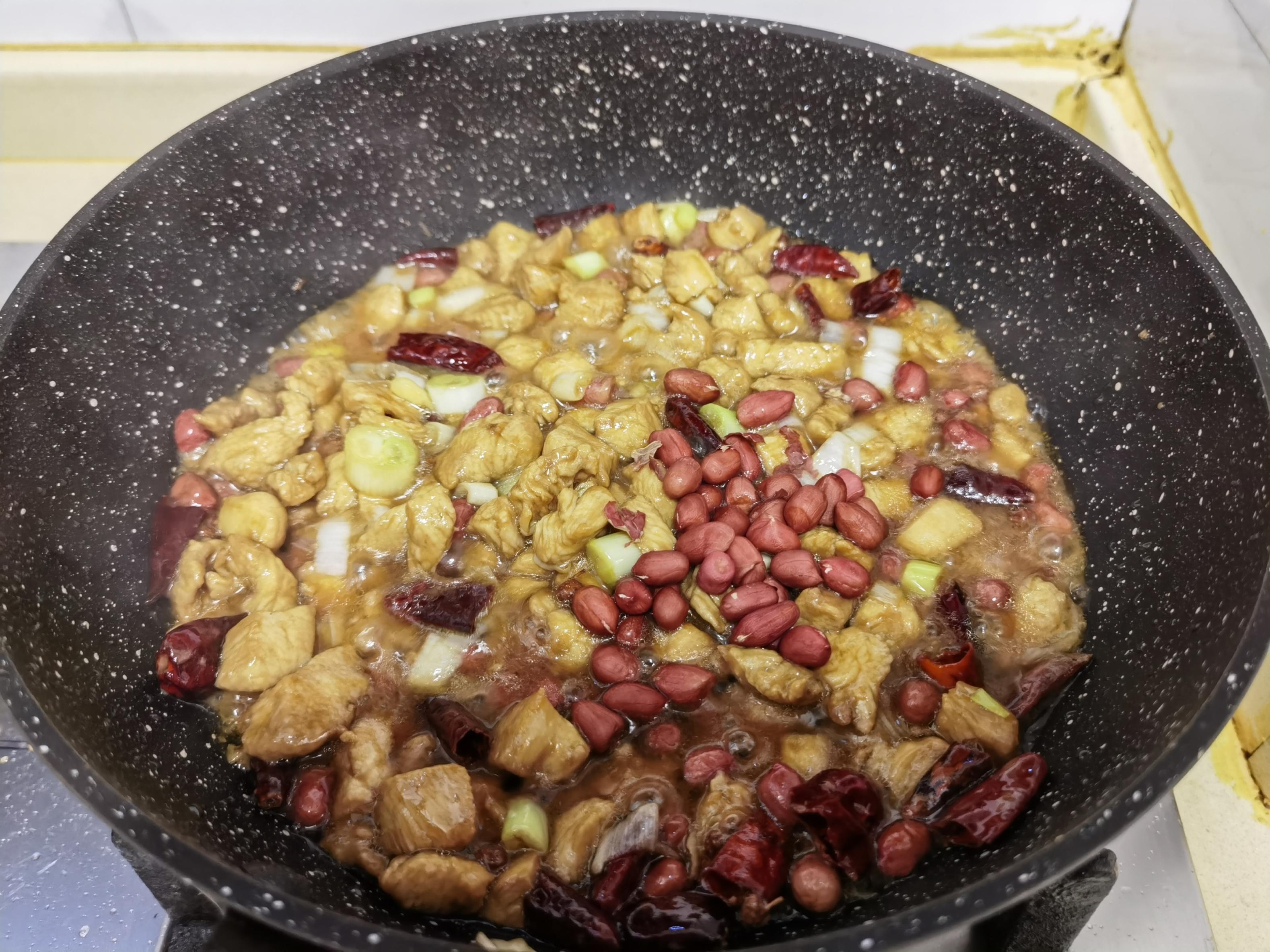 在汁水將要收好前倒入油炸花生米,翻炒兩下,撒入蔥綠,再翻炒兩下即可出鍋。