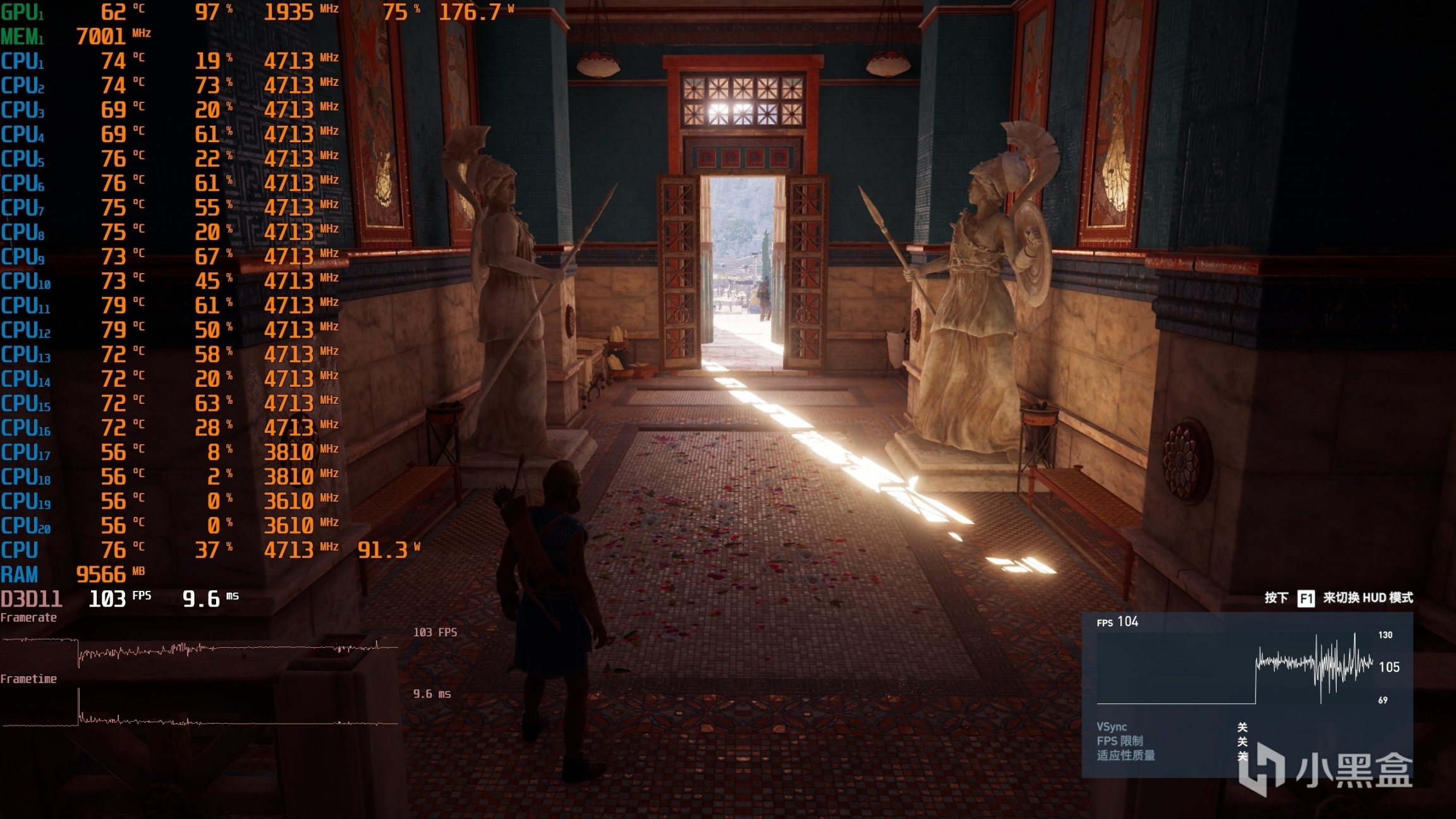 ▼衆生平等奧德賽,2K分辨率,全極高畫質,體積雲最低,走廊遊戲幀數在103幀左右。