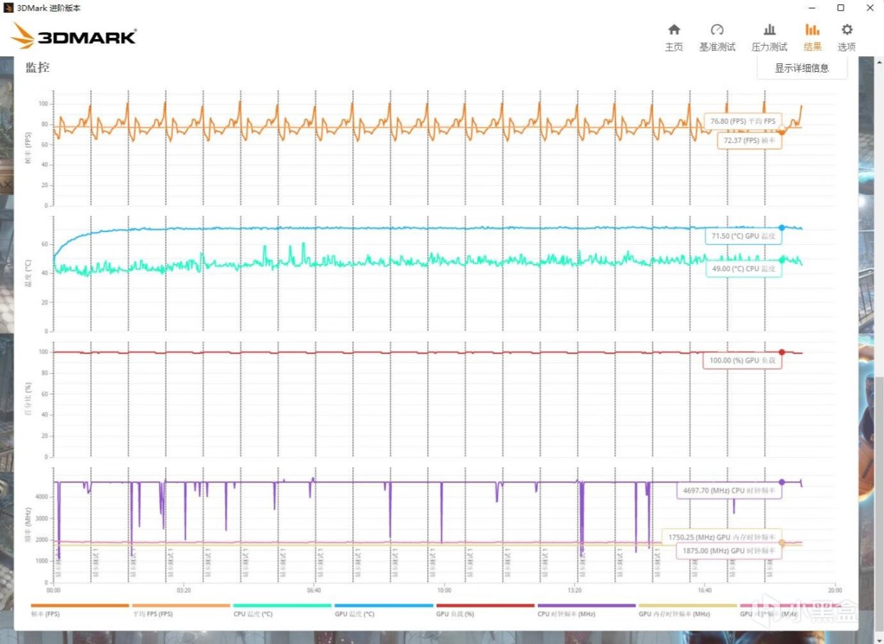 ▼跑個3Dmark的壓力測試,TS模式,幀數穩定率在98.7%,非常穩定。