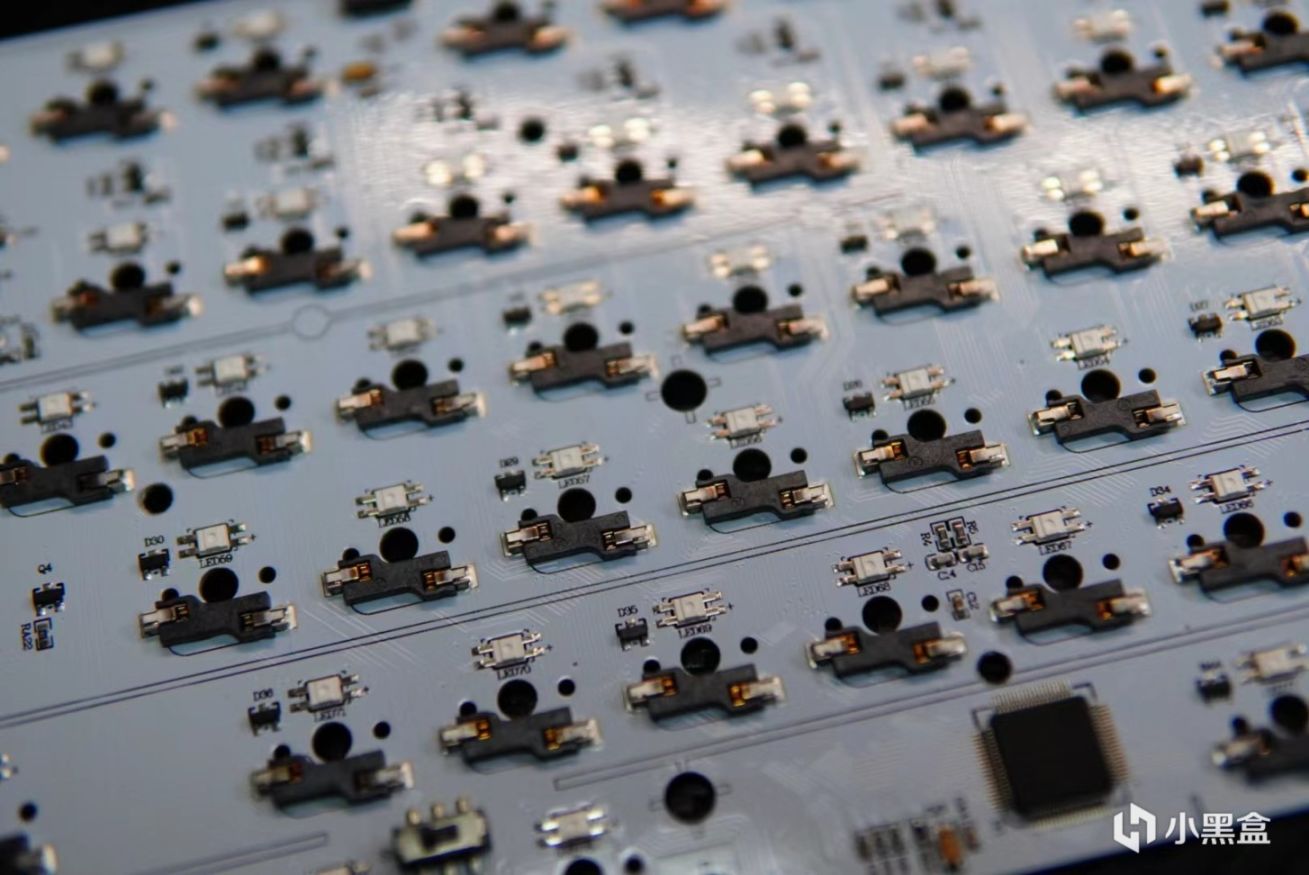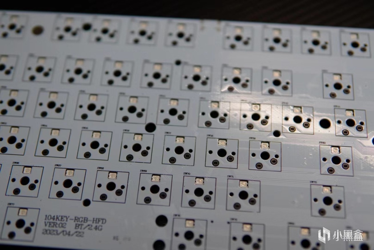 pcb正面採用了一個上燈位的設計,也就是我們經常遇見的燈位設計,這個設計唯一不足的就是再試用側刻鍵帽的時候燈光效果沒有下燈位的明顯。