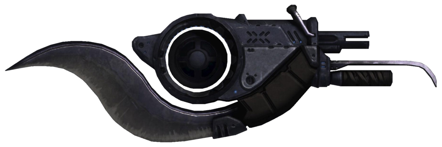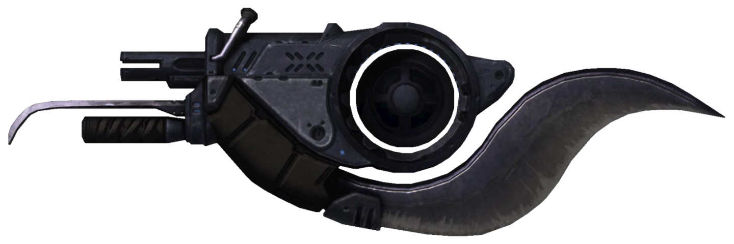 它似乎有兩種供彈具:一種擁有四發彈容,發射有明顯彈道下墜的榴彈,以及一種六發彈容,沒有明顯彈道下墜,且在三秒後會引爆的榴彈。榴彈似乎是通過武器頂部的供彈口上膛的。這把武器的爆炸濺射傷害相當高。它的底部有一個鋒利的彎曲刀片,是一種強大的近戰手段。刀片能夠提供高於正常武器的近戰傷害。