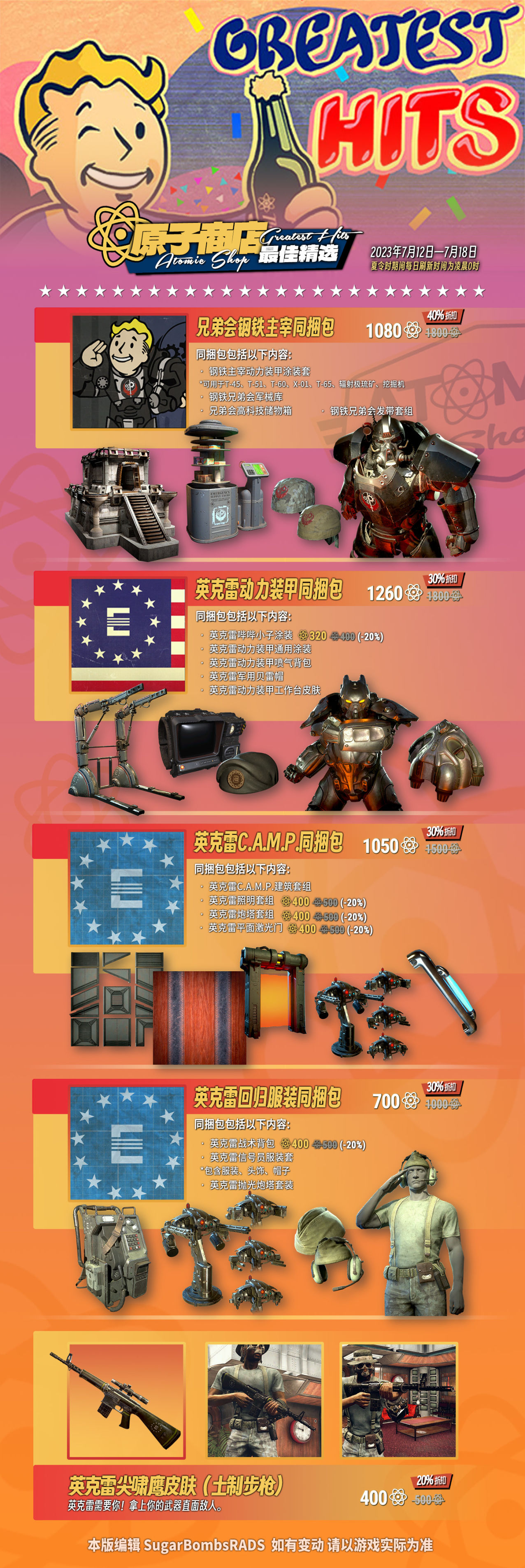 最佳精选:兄弟会同捆包、英克雷同捆包(英克雷动力装甲通用涂装)、英克雷C.A.M.P.同捆包(英克雷炮塔套组)、英克雷回归服装同捆包
