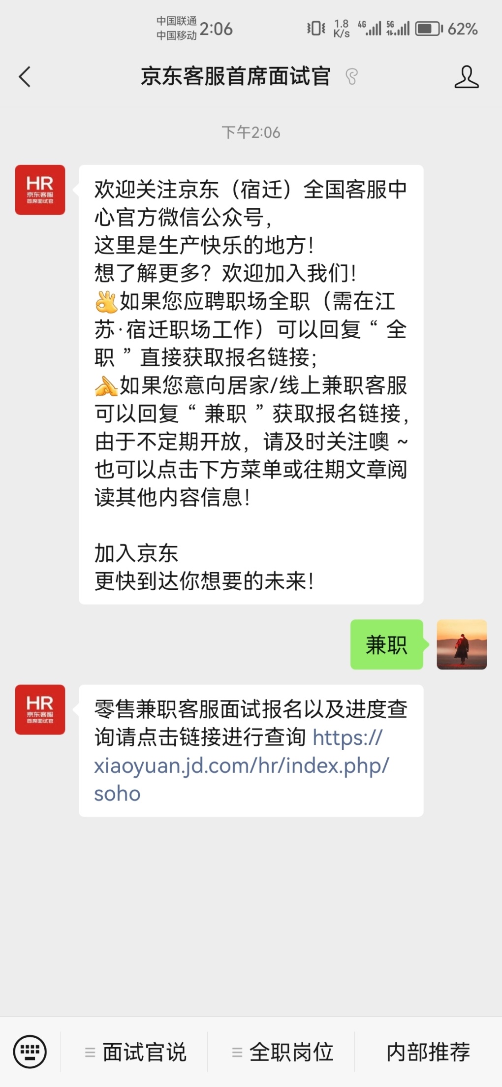 還有京東的兼職客服在微信公衆號,京東客服首席面試官,是不定時的發佈招聘信息,如果發佈了我會第一時間告訴大家的