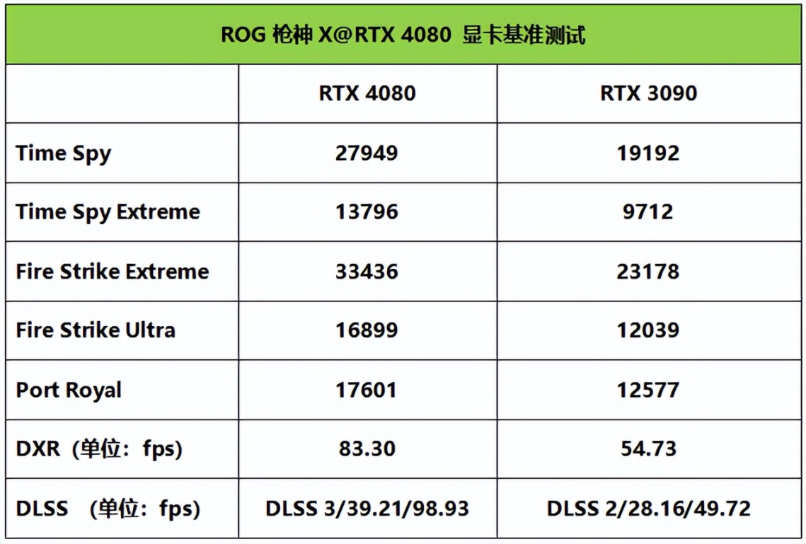 在DX11中,ROG槍神X搭載的RTX 4080相比RTX 3090領先幅度分別爲28%和44%。在DX12中,RTX 4080領先RTX 3090大概在42%~45%,其中,在Time Spy場景裏,RTX 4080跑到了驚人的27949分,對於經常看筆記本測評的小夥伴來說,這是一個堪稱狂飆的數字!這也代表着,RTX 4080征服4K分辨率是沒有什麼問題的。