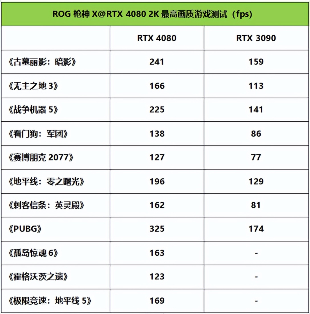 2K分辨率(2560×1440)最高畫質對於ROG槍神X來說真稱得上是小菜一碟,所有的測試遊戲都能跑到100fps以上的幀速,並且最低測試遊戲也跑到了120fps以上,比如優化較差的《賽博朋克2077》也跑到了127fps,至於電競遊戲,就更不是問題了,《PUBG》跑到了325fps。所以,如果你是2K高刷顯示器,那麼ROG槍神X能讓你體會到電競級3A遊戲幀速,體驗非常棒。相對於RTX 3090,RTX 4080的遊戲幀速暴增,《刺客信條:英靈殿》更是實現了幀速翻倍,當然其中應該也有處理器的因素。