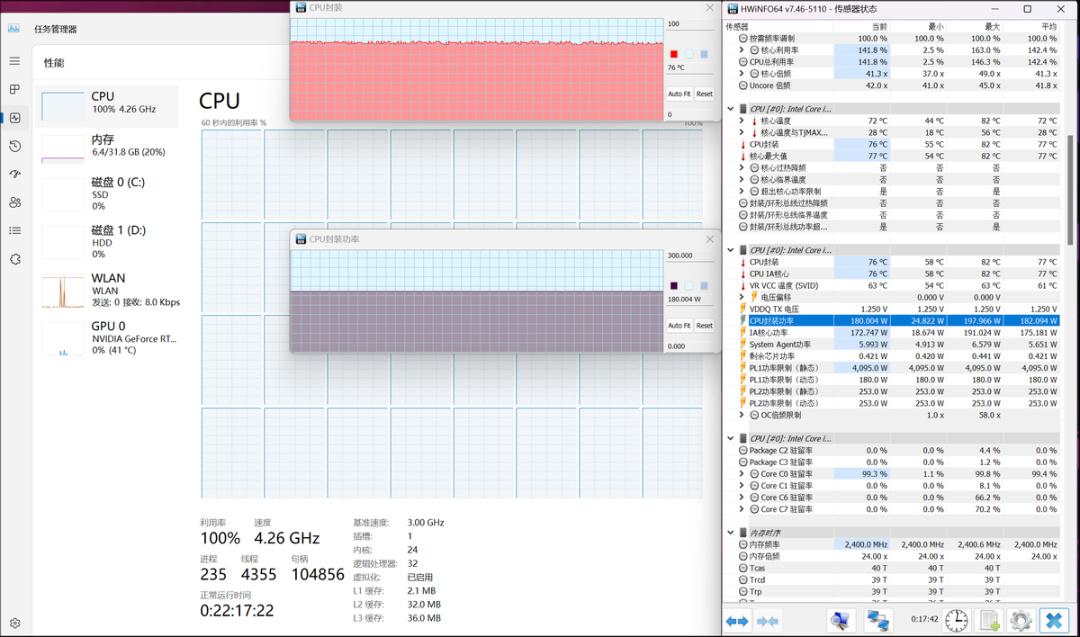 ROG槍神X搭載的是i9 13900KF理器,在“增強”模式下,對該機進行單考FPU測試,i9 13900KF的初始功耗能爆發到200W左右,持續一段時間之後,穩定輸出功率爲180W,處理器溫度80℃以內,對於i9 13900KF來說,這是一個相當低的考機溫度。