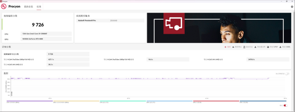 視頻剪輯也是當下非常流行的專業應用,牛叔利用UL的Pr視頻測試來考察ROG槍神X的視頻輸出效率,測試成績達到了9726分,這是非常高的分數。移動端24核32線程處理器的i9 13980HX+RTX 4060的參考分數是6358分。