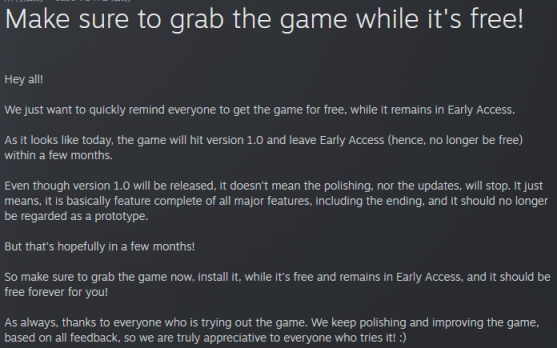 从目前的情况来看,游戏将在几个月内推出1.0版本并退出Early Access(因此不再免费)。