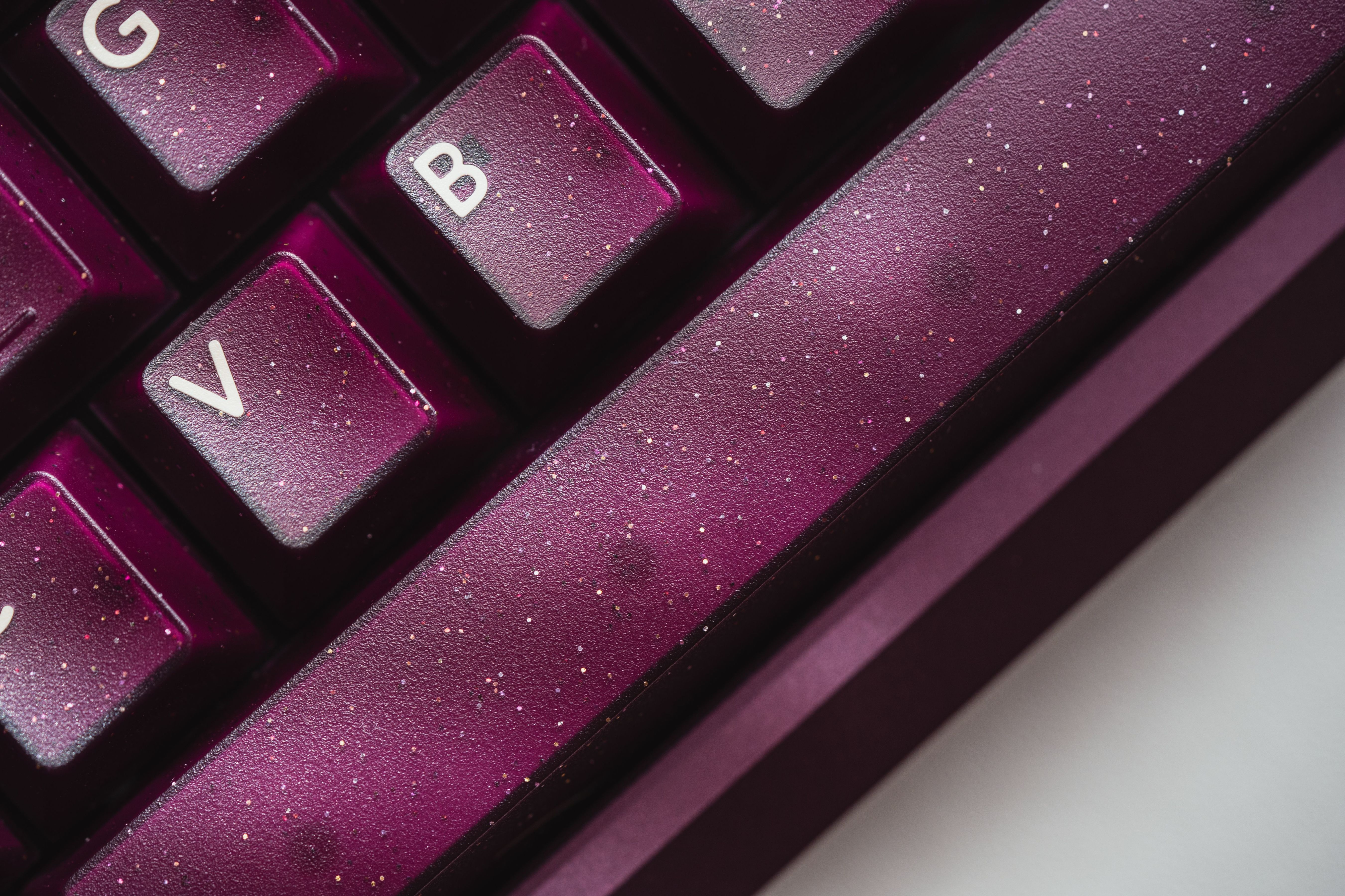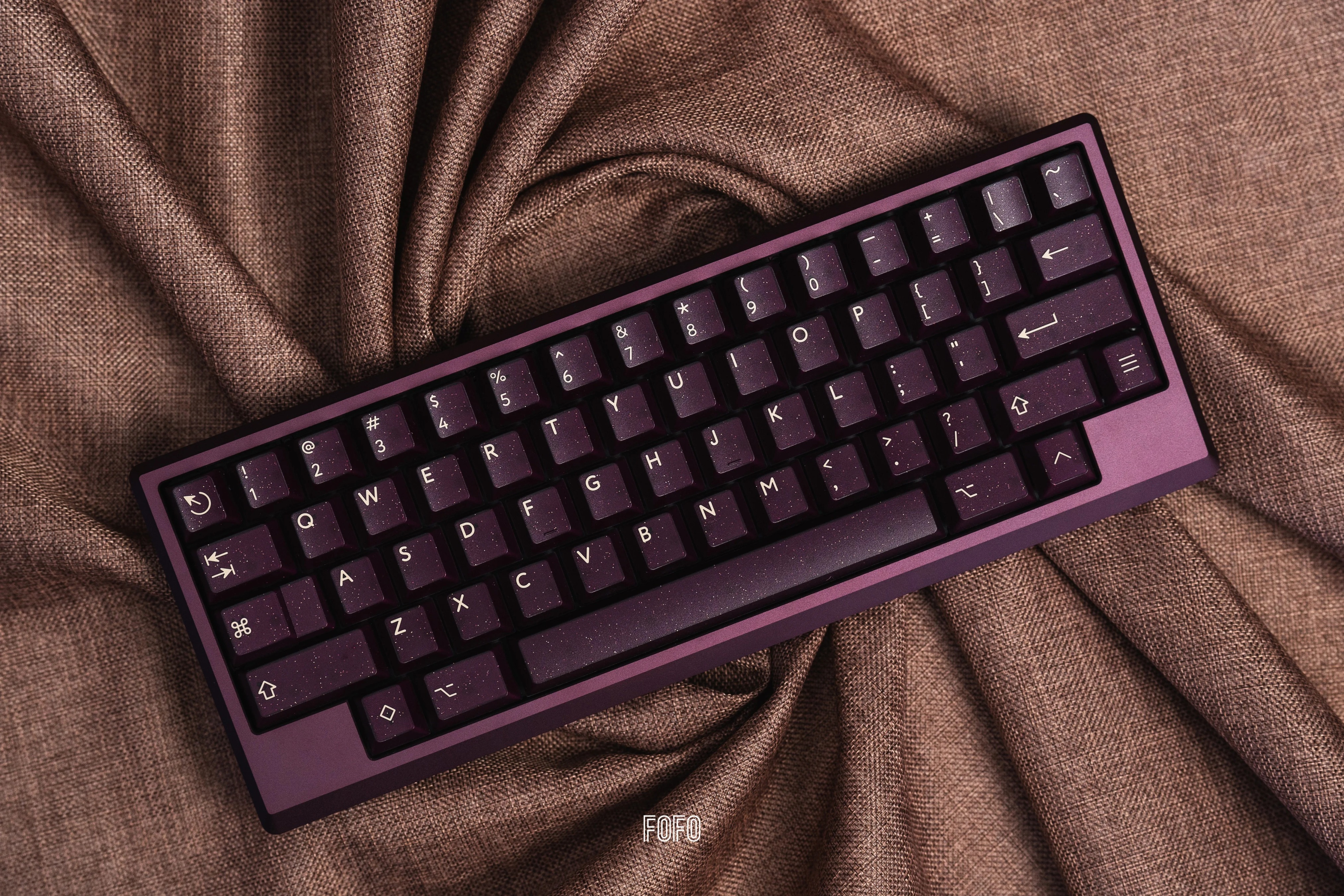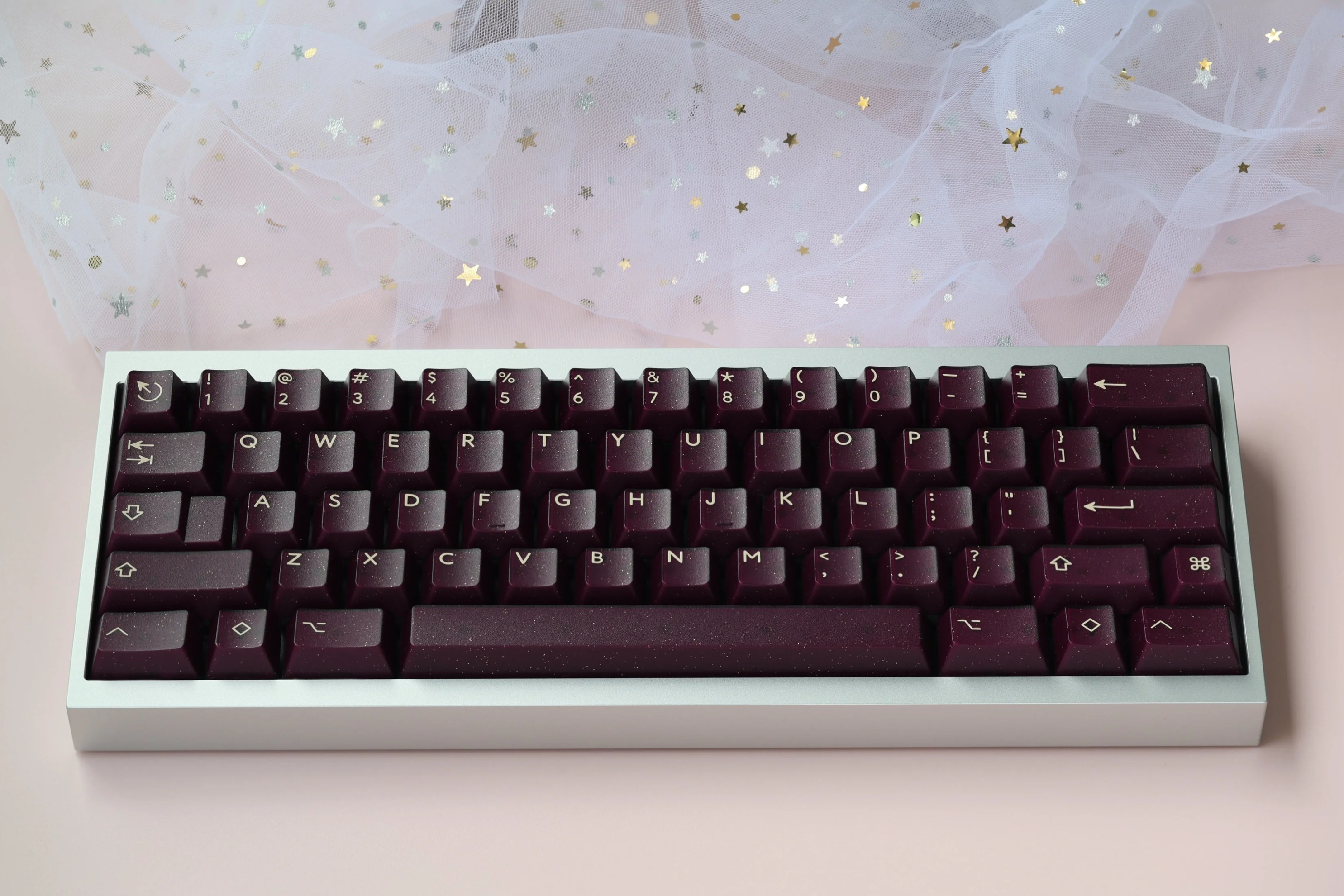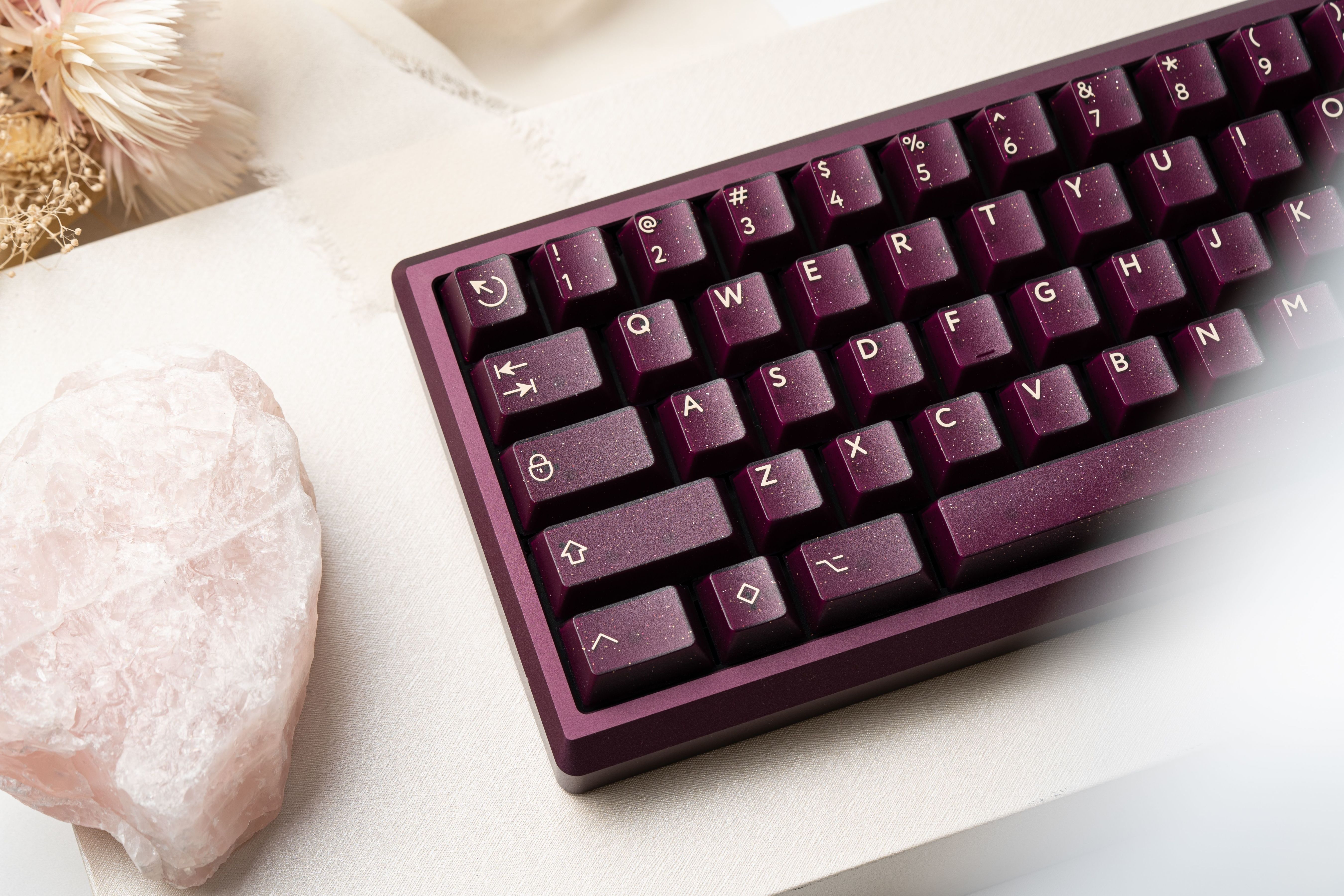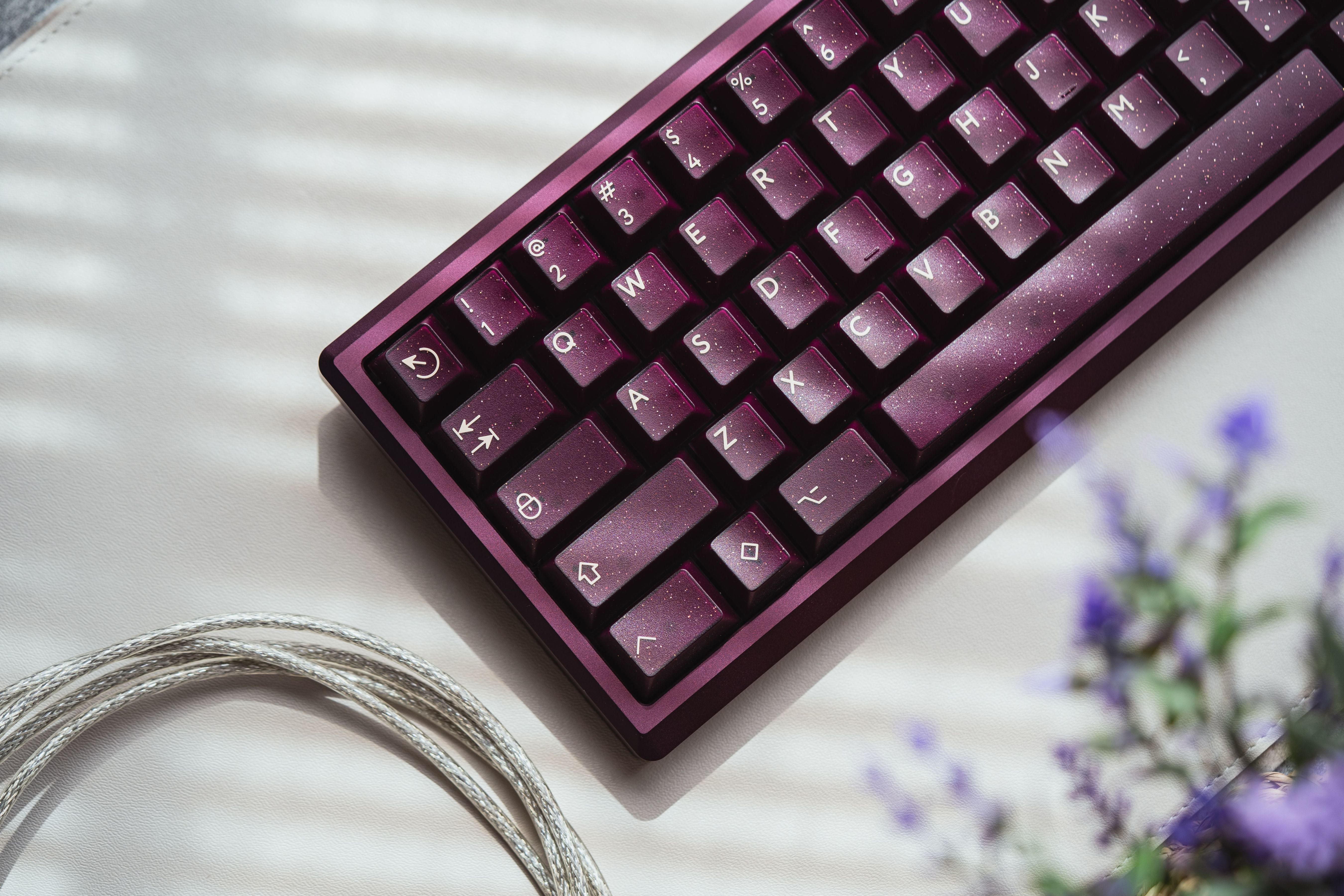 深紫色的半透外殼加入金、銀閃粉的設計,使得鍵帽更具立體感,深邃的背景色與米色形成鮮明的對比。同時深紫色和閃粉的搭配使得這套鍵帽看起來神祕而華麗,猶如一抹星雲。值得一提的是,深邃顏色和半透材質的搭配,使得鍵帽在不同的角度和光線下呈現出不同的效果,如同宇宙中的星塵點綴。