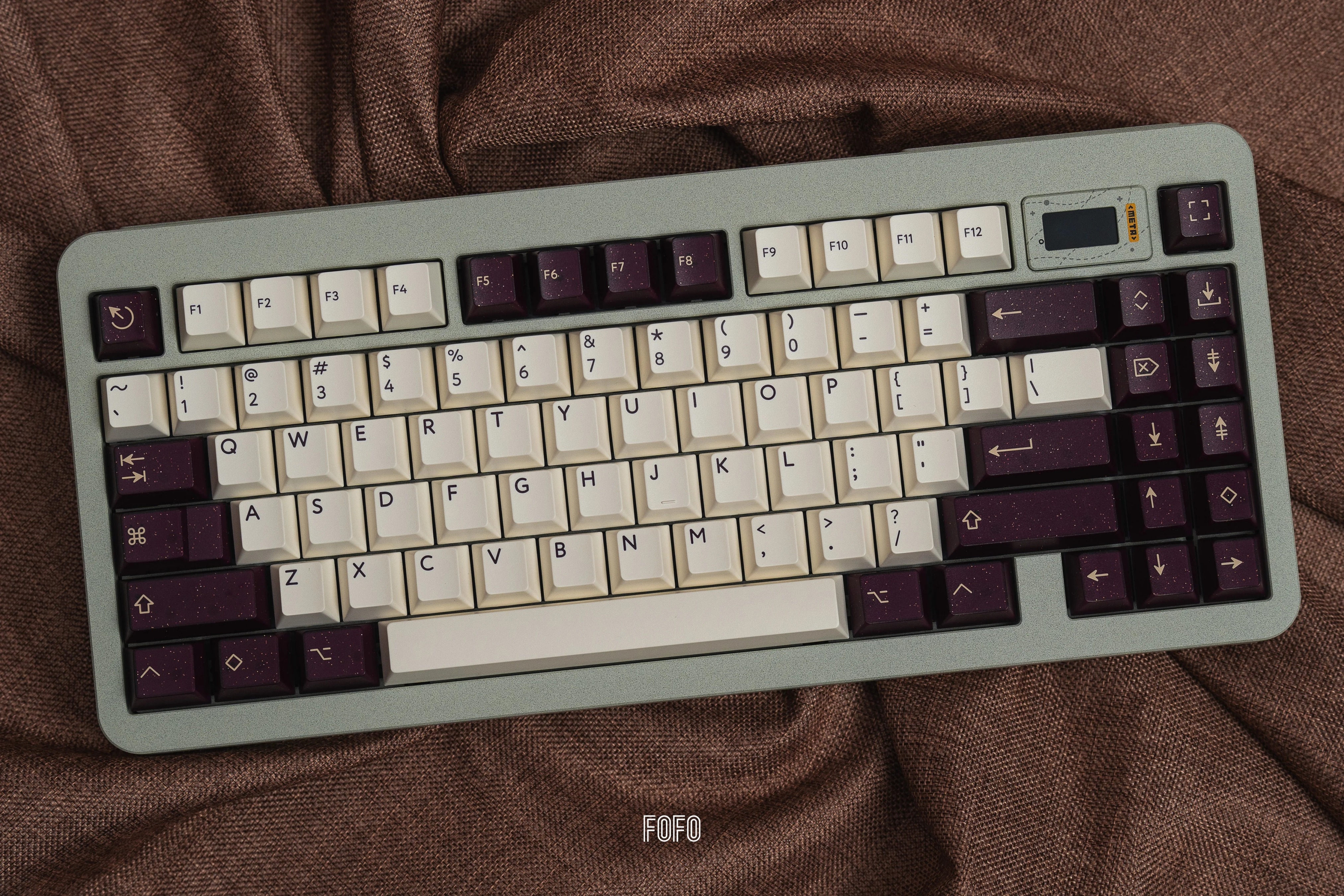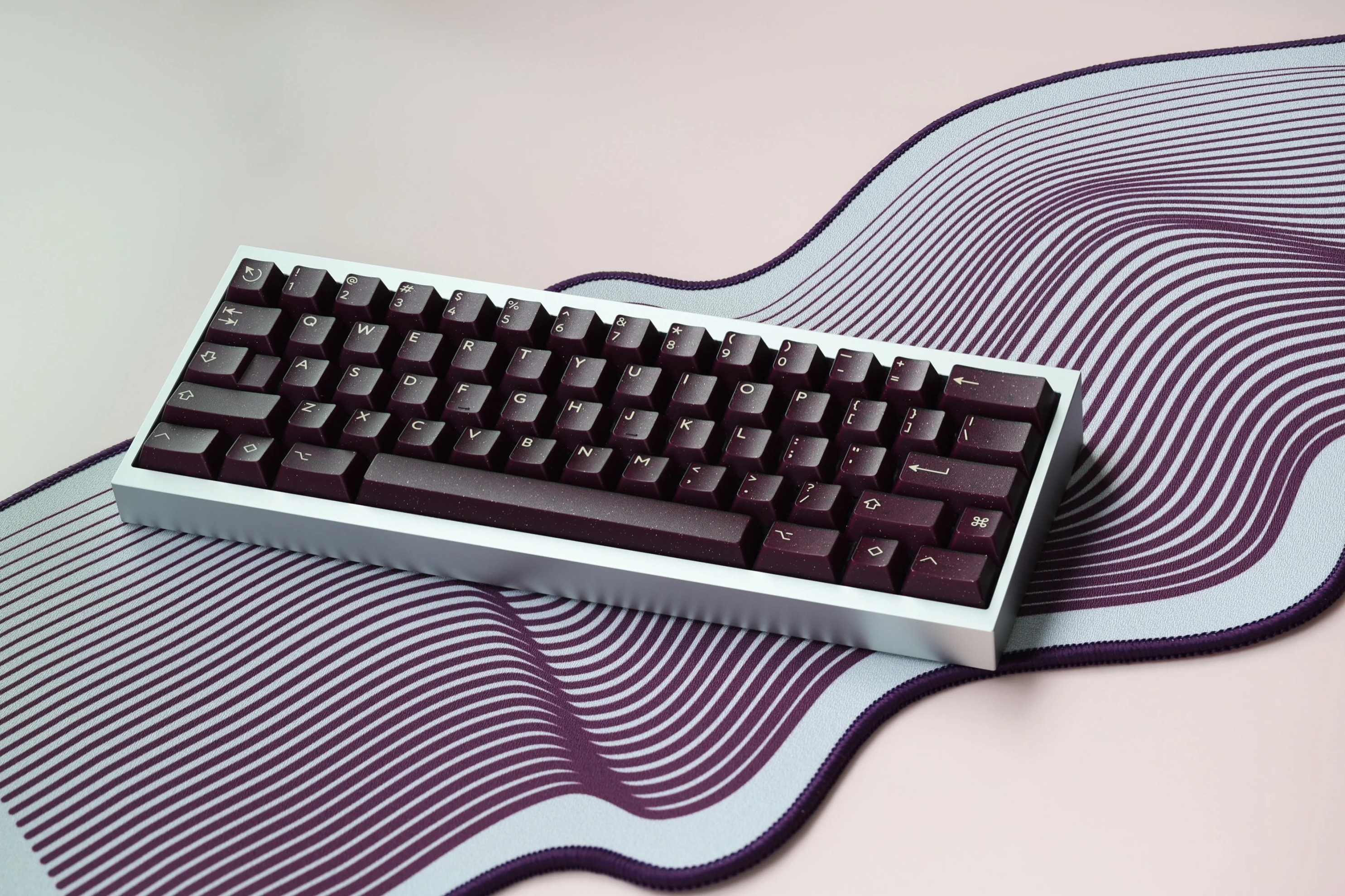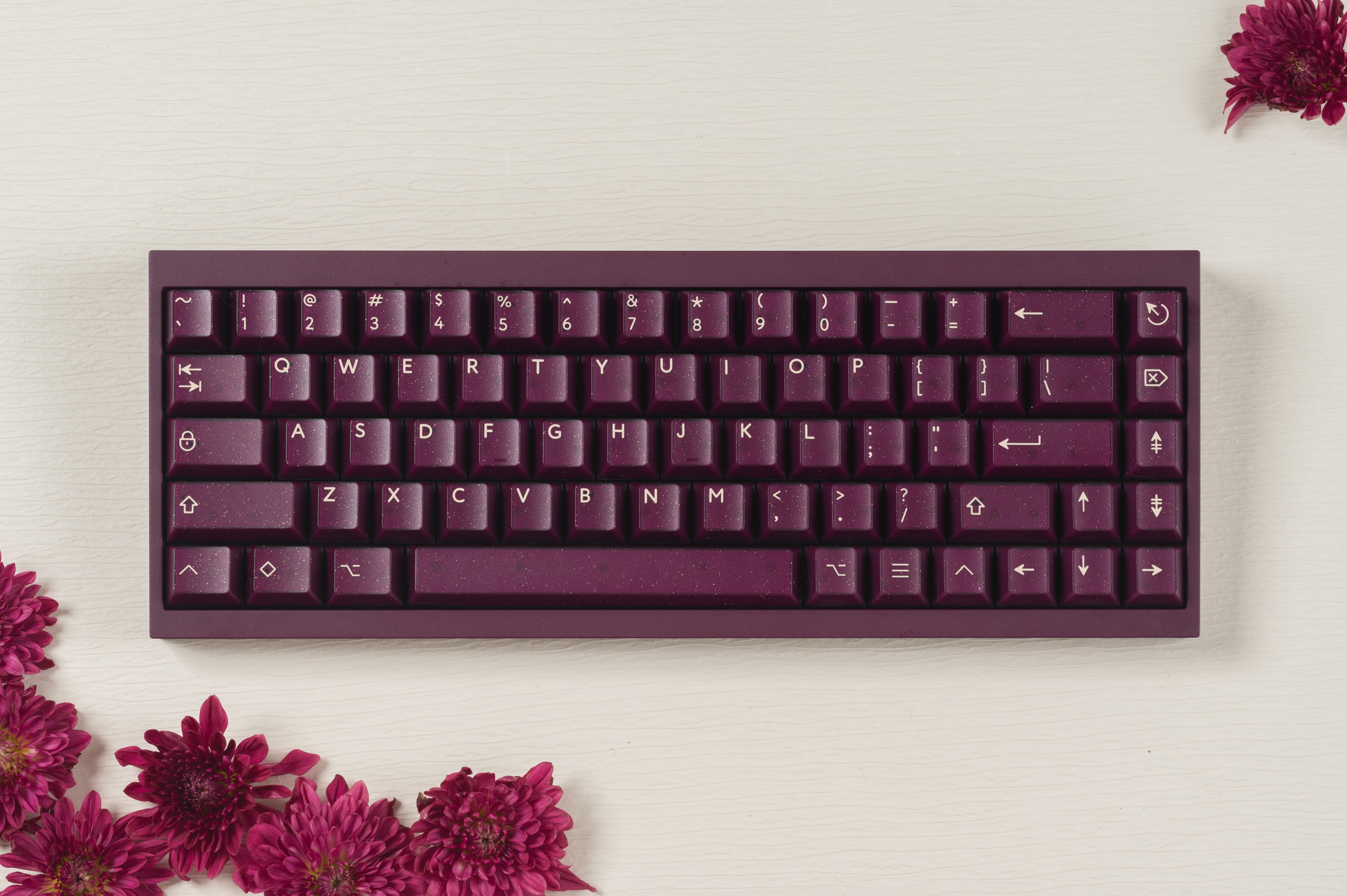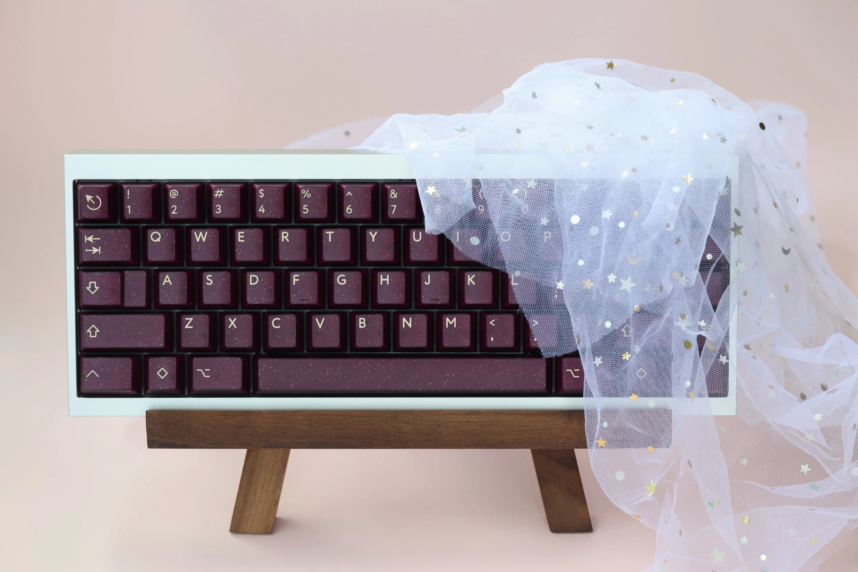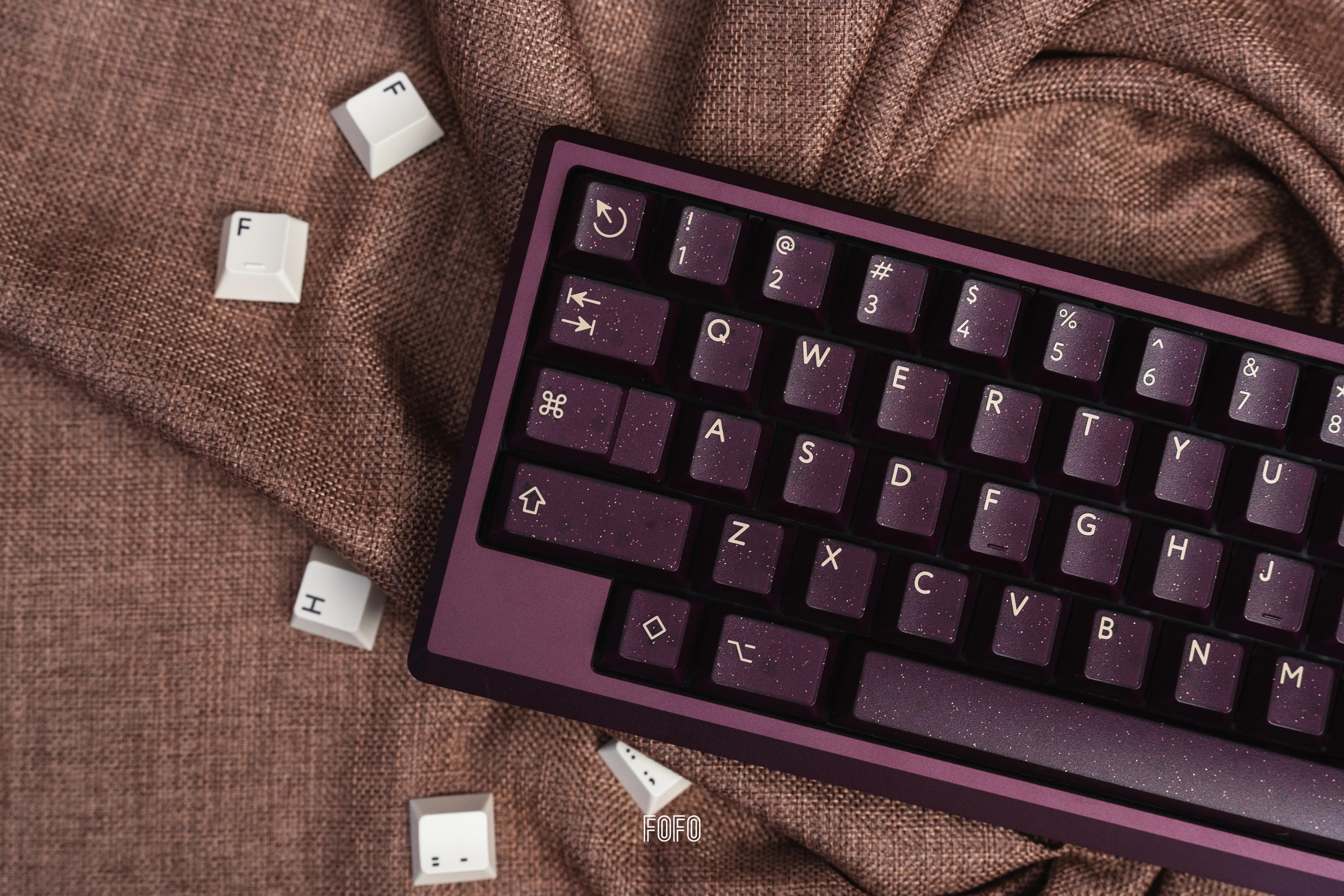 深紫色的半透外殼加入金、銀閃粉的設計,使得鍵帽更具立體感,深邃的背景色與米色形成鮮明的對比。同時深紫色和閃粉的搭配使得這套鍵帽看起來神祕而華麗,猶如一抹星雲。值得一提的是,深邃顏色和半透材質的搭配,使得鍵帽在不同的角度和光線下呈現出不同的效果,如同宇宙中的星塵點綴。