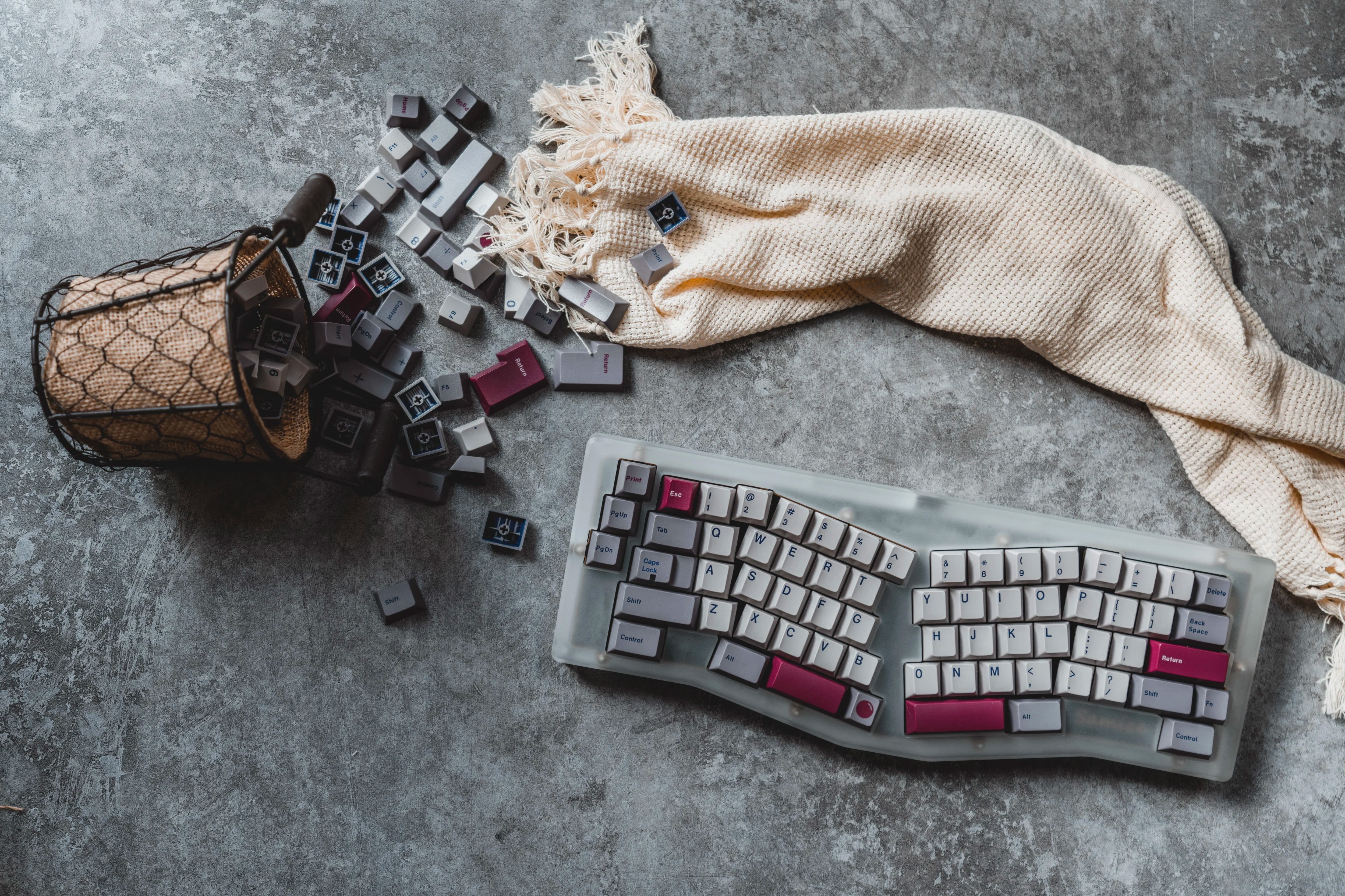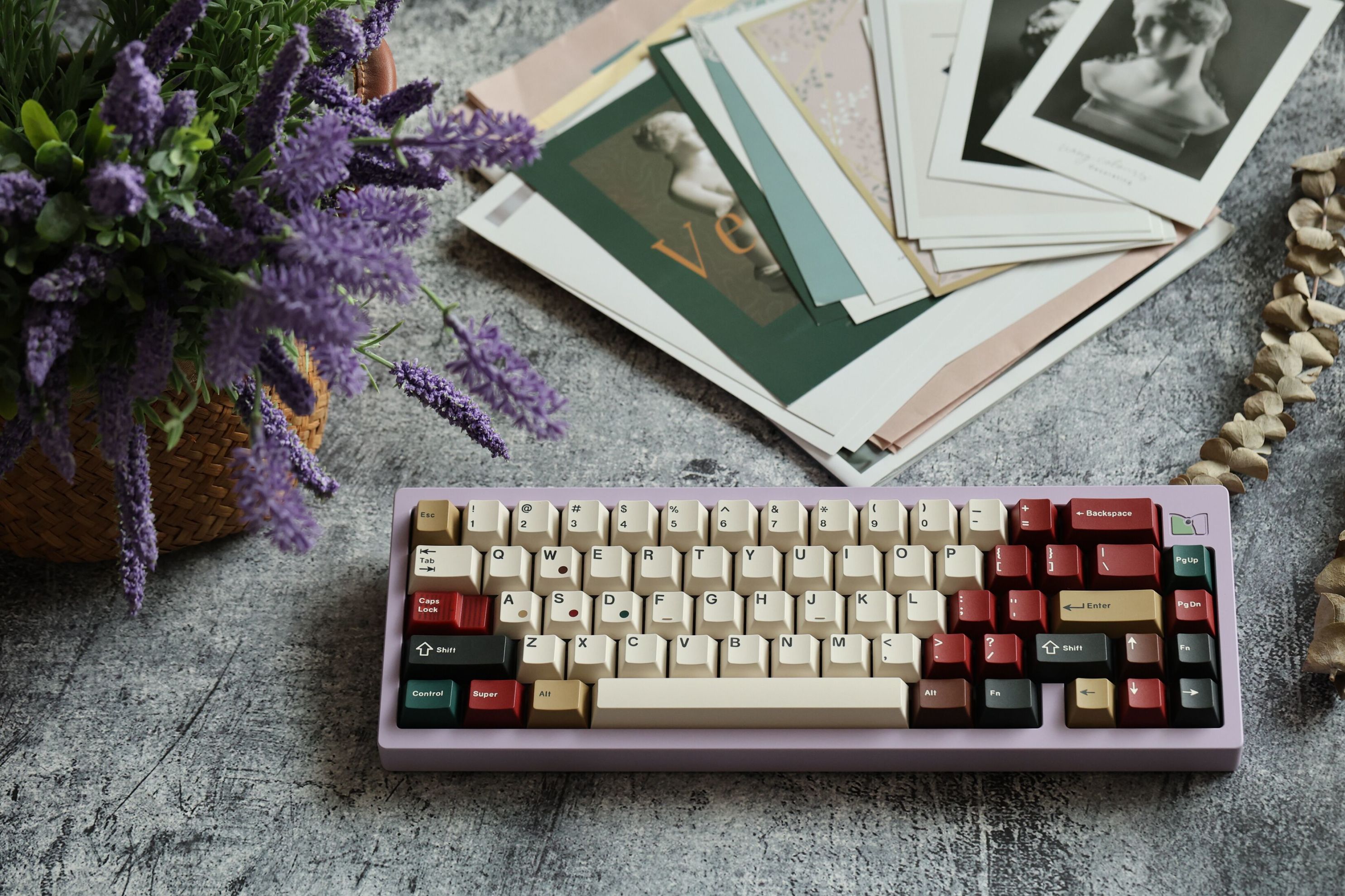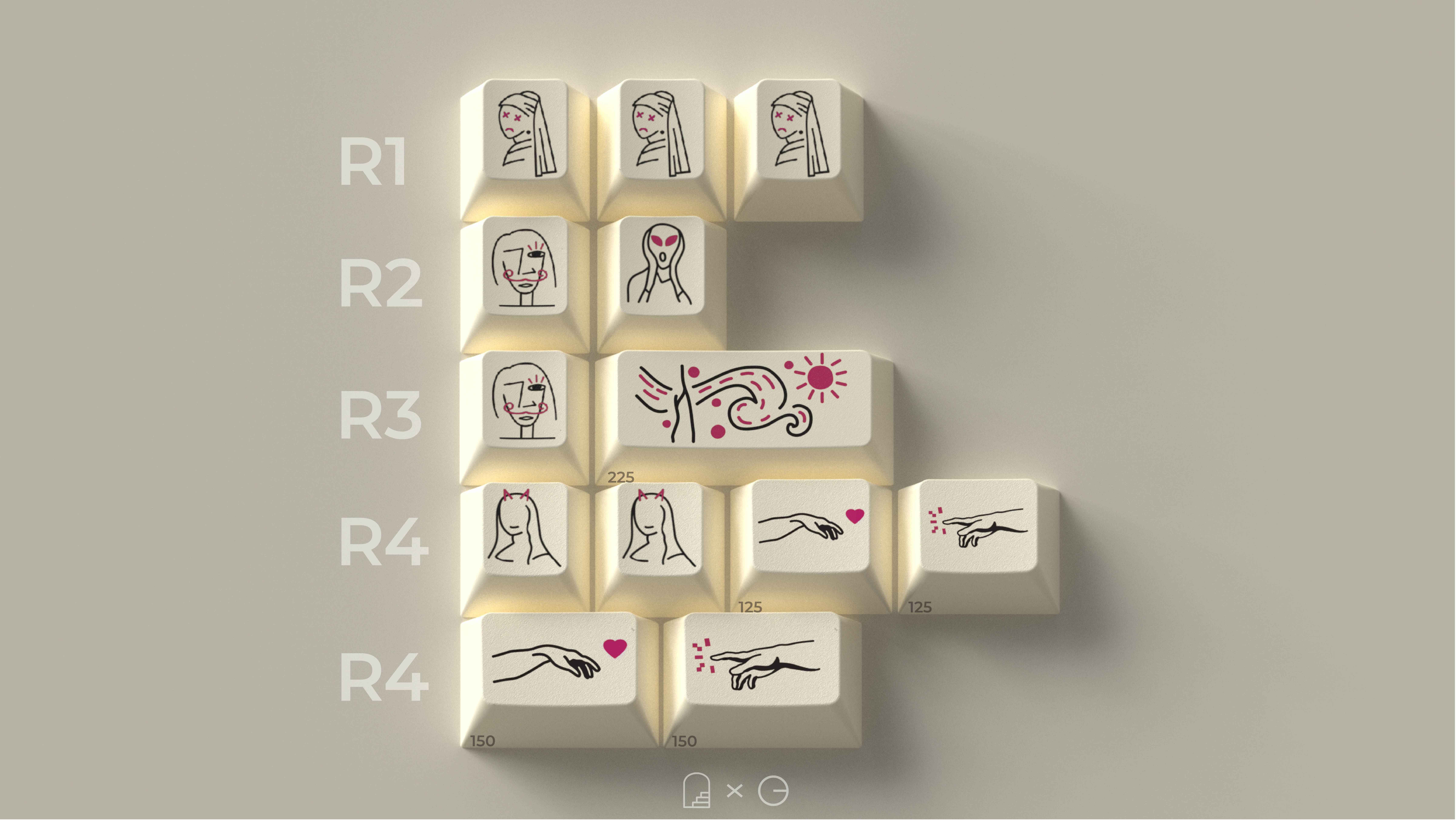 因爲我選擇的大多數畫作都是在畫布上繪製的,所以我馬上想到這套鍵帽的主色調應該是米色。不過,我還想再加入一些元素,來將古典繪畫與街頭藝術聯繫在一起,於是我加入了一些粉色的點綴。