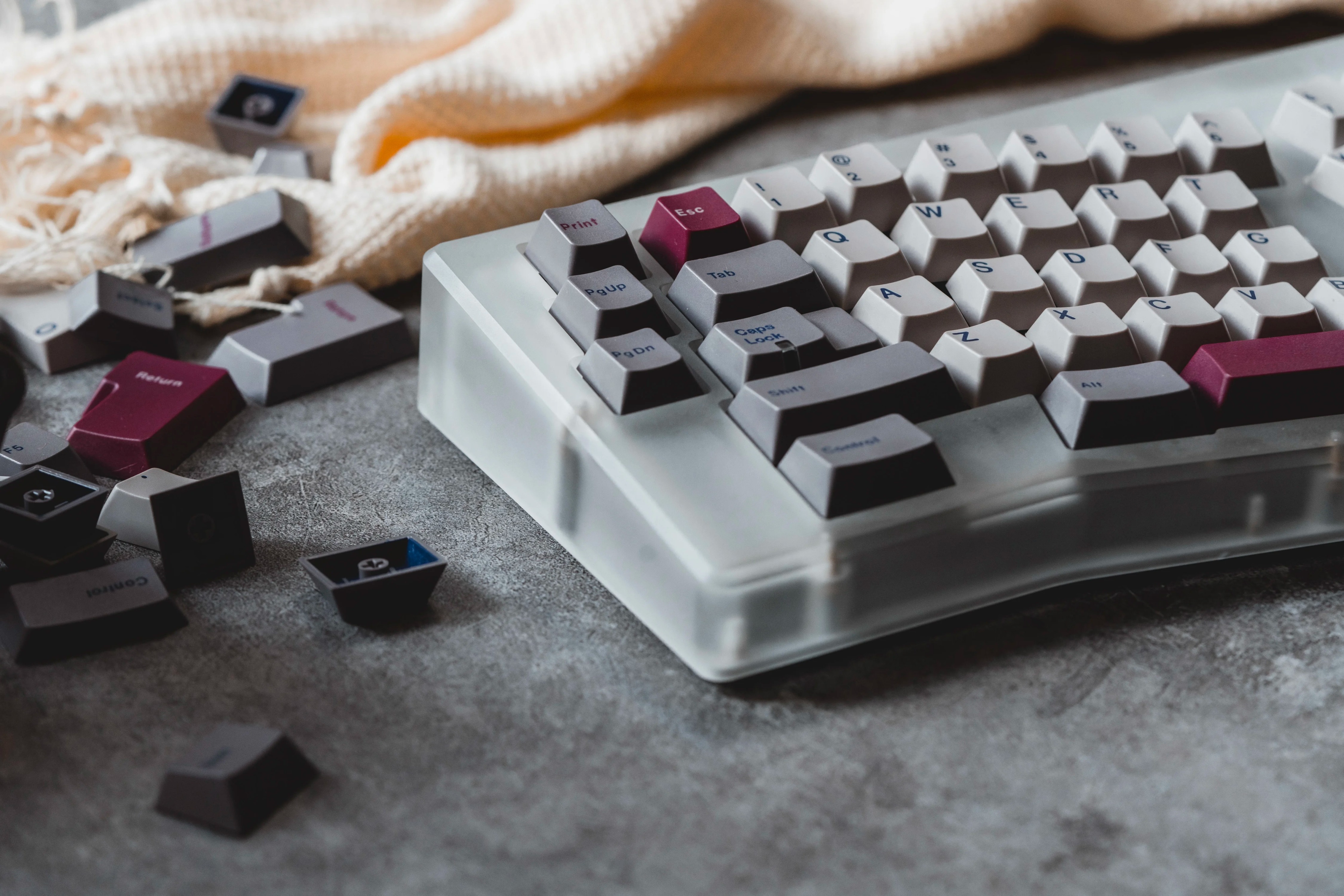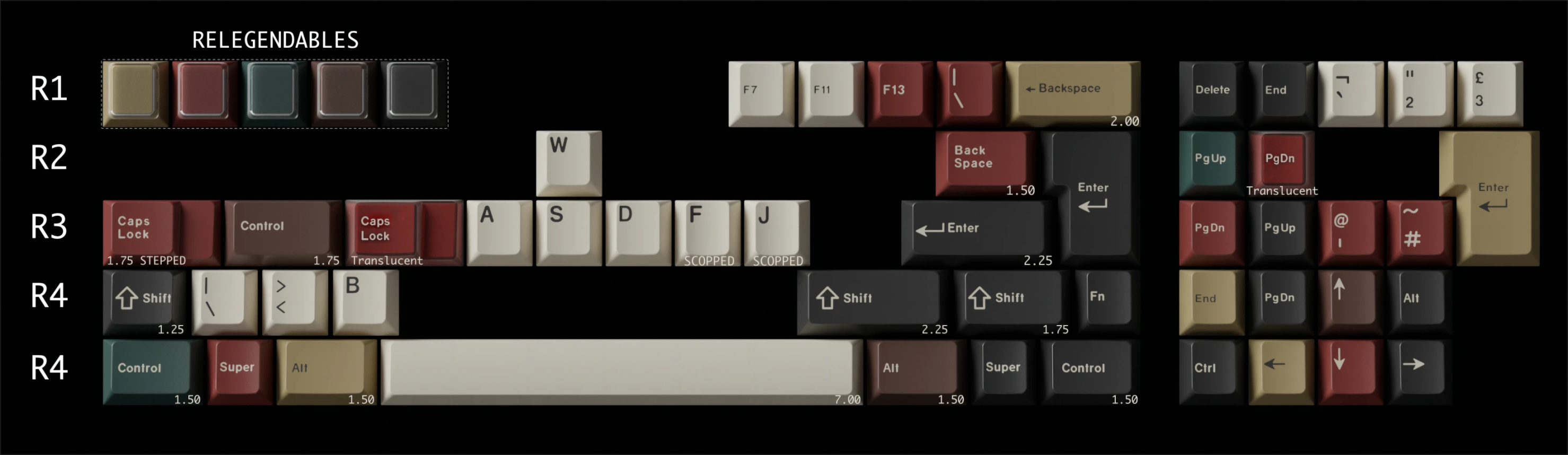 原先這幾種顏色是Han通過老鍵盤拆機得到的混搭鍵帽,營造出懷舊的氛圍,而在這套鍵帽中,則是用了半透和蓋帽增補來增貼復古風味。