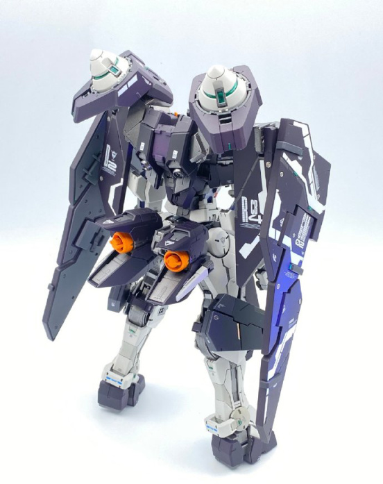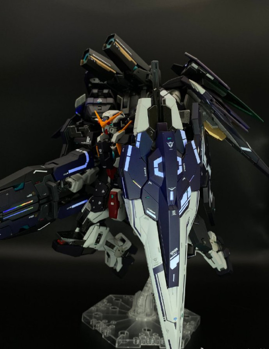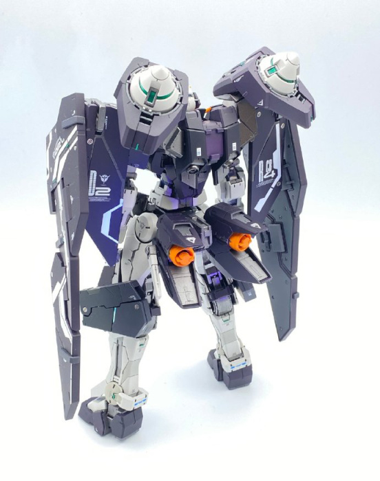 除了配色進行重塗外,外形也做了一些變化,肩部新增加了兩個太陽爐,還搭載了00Q的大劍,揹包部分大家知道搭載的是什麼高達模型的零件嗎?