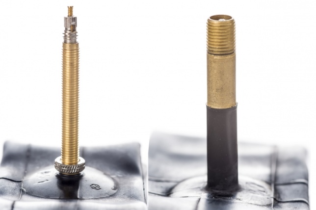 法式氣嘴(左,常用於公路車),美式氣嘴(右,常用於山地車)