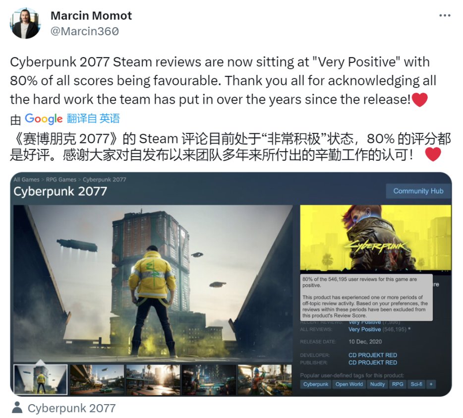 據CDPR全球社區總監Marcin Momot的消息,《賽博朋克2077》的Steam評價升至“特別好評”,在546249位玩家的評價中,80%的評價爲好評。