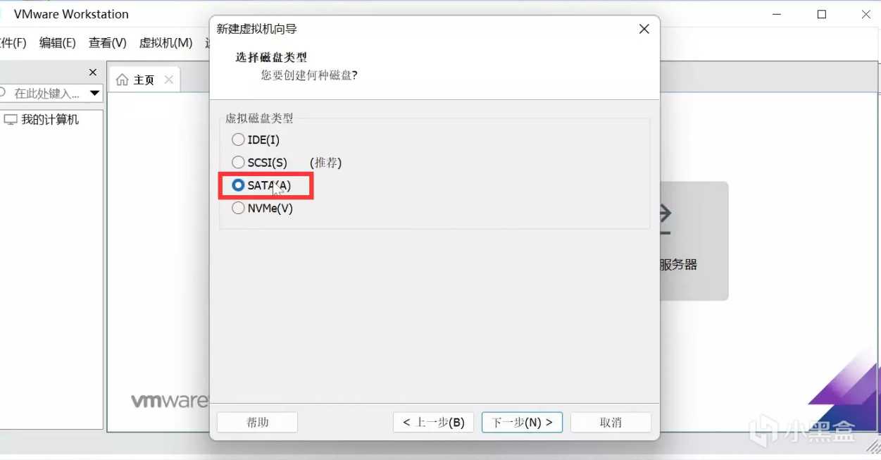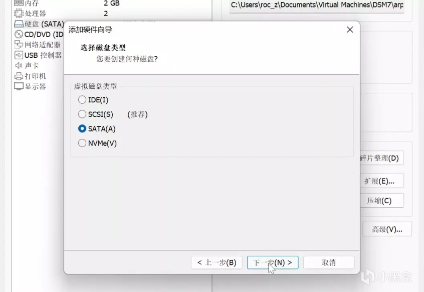 ▼在不加SATA接口應破案的情況下選擇創建新虛擬磁盤,關於使用物理磁盤(直通)咱們放到後面講。